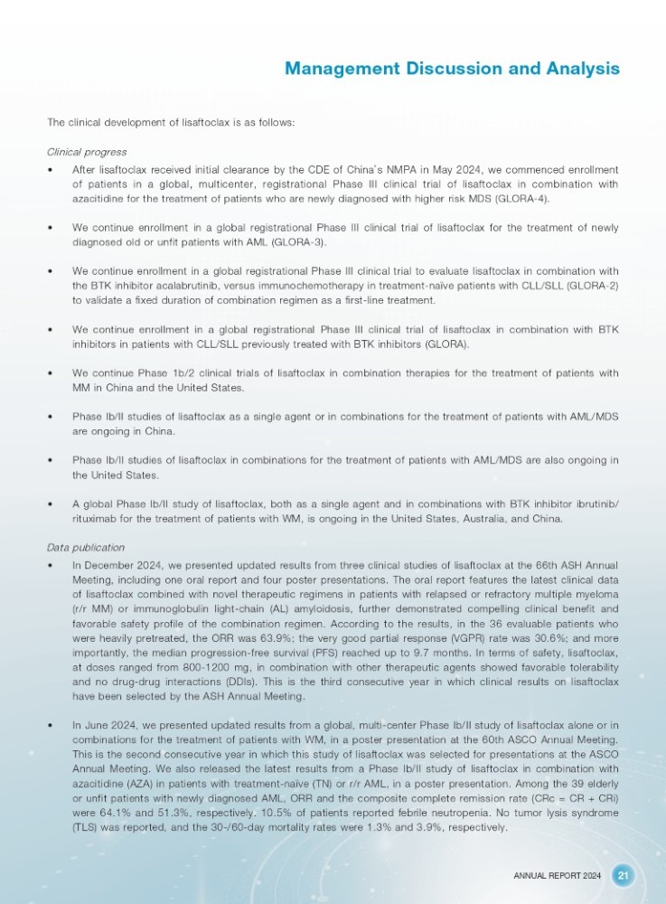 ANNUAL REPORT 2024 21 Management Discussion and Analysis The clinical development of lisaftoclax is as follows: Clinical progress • After lisaftoclax received initial clearance by the CDE of China ’ s NMPA in May 2024 , we commenced enrollment of patients in a global, multicenter, registrational Phase III clinical trial of lisaftoclax in combination with azacitidine for the treatment of patients who are newly diagnosed with higher risk MDS (GLORA - 4 ) . • We continue enrollment in a global registrational Phase III clinical trial of lisaftoclax for the treatment of newly diagnosed old or unfit patients with AML (GLORA - 3 ) . • We continue enrollment in a global registrational Phase III clinical trial to evaluate lisaftoclax in combination with the BTK inhibitor acalabrutinib, versus immunochemotherapy in treatment - naïve patients with CLL/SLL (GLORA - 2 ) to validate a fixed duration of combination regimen as a first - line treatment . • We continue enrollment in a global registrational Phase III clinical trial of lisaftoclax in combination with BTK inhibitors in patients with CLL/SLL previously treated with BTK inhibitors (GLORA) . • We continue Phase 1 b/ 2 clinical trials of lisaftoclax in combination therapies for the treatment of patients with MM in China and the United States . • Phase Ib/II studies of lisaftoclax as a single agent or in combinations for the treatment of patients with AML/MDS are ongoing in China . • Phase Ib/II studies of lisaftoclax in combinations for the treatment of patients with AML/MDS are also ongoing in the United States . • A global Phase Ib/II study of lisaftoclax, both as a single agent and in combinations with BTK inhibitor ibrutinib/ rituximab for the treatment of patients with WM, is ongoing in the United States, Australia, and China . Data publication • In December 2024 , we presented updated results from three clinical studies of lisaftoclax at the 66 th ASH Annual Meeting, including one oral report and four poster presentations . The oral report features the latest clinical data of lisaftoclax combined with novel therapeutic regimens in patients with relapsed or refractory multiple myeloma (r/r MM) or immunoglobulin light - chain (AL) amyloidosis, further demonstrated compelling clinical benefit and favorable safety profile of the combination regimen . According to the results, in the 36 evaluable patients who were heavily pretreated, the ORR was 63 . 9 % ; the very good partial response (VGPR) rate was 30 . 6 % ; and more importantly, the median progression - free survival (PFS) reached up to 9 . 7 months . In terms of safety, lisaftoclax, at doses ranged from 800 - 1200 mg, in combination with other therapeutic agents showed favorable tolerability and no drug - drug interactions (DDIs) . This is the third consecutive year in which clinical results on lisaftoclax have been selected by the ASH Annual Meeting . • In June 2024 , we presented updated results from a global, multi - center Phase Ib/II study of lisaftoclax alone or in combinations for the treatment of patients with WM, in a poster presentation at the 60 th ASCO Annual Meeting . This is the second consecutive year in which this study of lisaftoclax was selected for presentations at the ASCO Annual Meeting . We also released the latest results from a Phase Ib/II study of lisaftoclax in combination with azacitidine (AZA) in patients with treatment - naïve (TN) or r/r AML, in a poster presentation . Among the 39 elderly or unfit patients with newly diagnosed AML, ORR and the composite complete remission rate (CRc = CR + CRi) were 64 . 1 % and 51 . 3 % , respectively . 10 . 5 % of patients reported febrile neutropenia . No tumor lysis syndrome (TLS) was reported, and the 30 - / 60 - day mortality rates were 1 . 3 % and 3 . 9 % , respectively .