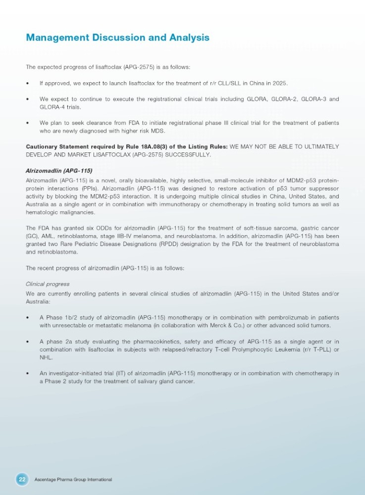 Ascentage Pharma Group International 22 Management Discussion and Analysis The expected progress of lisaftoclax (APG - 2575 ) is as follows : • If approved, we expect to launch lisaftoclax for the treatment of r/r CLL/SLL in China in 2025. • We expect to continue to execute the registrational clinical trials including GLORA, GLORA - 2 , GLORA - 3 and GLORA - 4 trials . • We plan to seek clearance from FDA to initiate registrational phase III clinical trial for the treatment of patients who are newly diagnosed with higher risk MDS . Cautionary Statement required by Rule 18 A . 08 ( 3 ) of the Listing Rules : WE MAY NOT BE ABLE TO ULTIMATELY DEVELOP AND MARKET LISAFTOCLAX (APG - 2575 ) SUCCESSFULLY . Alrizomadlin (APG - 115 ) Alrizomadlin (APG - 115 ) is a novel, orally bioavailable, highly selective, small - molecule inhibitor of MDM 2 - p 53 protein - protein interactions (PPIs) . Alrizomadlin (APG - 115 ) was designed to restore activation of p 53 tumor suppressor activity by blocking the MDM 2 - p 53 interaction . It is undergoing multiple clinical studies in China, United States, and Australia as a single agent or in combination with immunotherapy or chemotherapy in treating solid tumors as well as hematologic malignancies . The FDA has granted six ODDs for alrizomadlin (APG - 115 ) for the treatment of soft - tissue sarcoma, gastric cancer (GC), AML, retinoblastoma, stage IIB - IV melanoma, and neuroblastoma . In addition, alrizomadlin (APG - 115 ) has been granted two Rare Pediatric Disease Designations (RPDD) designation by the FDA for the treatment of neuroblastoma and retinoblastoma . The recent progress of alrizomadlin (APG - 115 ) is as follows : Clinical progress We are currently enrolling patients in several clinical studies of alrizomadlin (APG - 115 ) in the United States and/or Australia : • A Phase 1 b/ 2 study of alrizomadlin (APG - 115 ) monotherapy or in combination with pembrolizumab in patients with unresectable or metastatic melanoma (in collaboration with Merck & Co . ) or other advanced solid tumors . • A phase 2 a study evaluating the pharmacokinetics, safety and efficacy of APG - 115 as a single agent or in combination with lisaftoclax in subjects with relapsed/refractory T - cell Prolymphocytic Leukemia (r/r T - PLL) or NHL . • An investigator - initiated trial (IIT) of alrizomadlin (APG - 115 ) monotherapy or in combination with chemotherapy in a Phase 2 study for the treatment of salivary gland cancer .