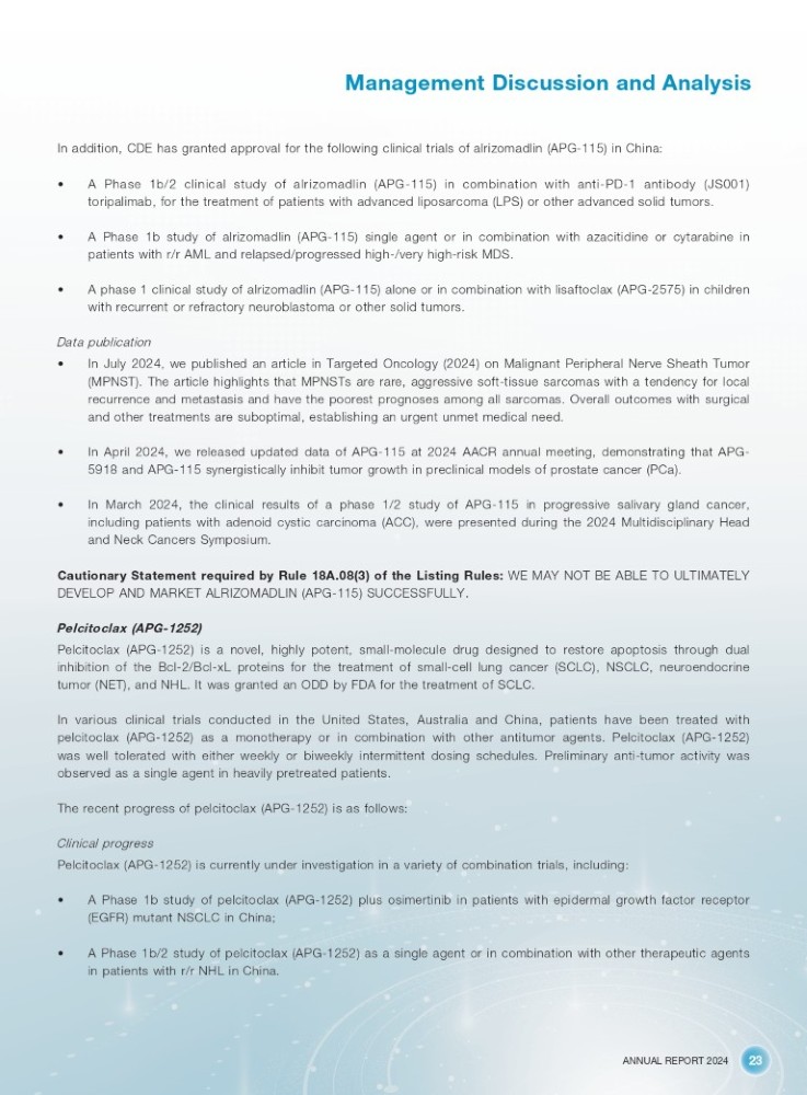 ANNUAL REPORT 2024 23 Management Discussion and Analysis In addition, CDE has granted approval for the following clinical trials of alrizomadlin (APG - 115) in China: • A Phase 1 b/ 2 clinical study of alrizomadlin (APG - 115 ) in combination with anti - PD - 1 antibody (JS 001 ) toripalimab, for the treatment of patients with advanced liposarcoma (LPS) or other advanced solid tumors . • A Phase 1 b study of alrizomadlin (APG - 115 ) single agent or in combination with azacitidine or cytarabine in patients with r/r AML and relapsed/progressed high - /very high - risk MDS . • A phase 1 clinical study of alrizomadlin (APG - 115 ) alone or in combination with lisaftoclax (APG - 2575 ) in children with recurrent or refractory neuroblastoma or other solid tumors . Data publication • In July 2024 , we published an article in Targeted Oncology ( 2024 ) on Malignant Peripheral Nerve Sheath Tumor (MPNST) . The article highlights that MPNSTs are rare, aggressive soft - tissue sarcomas with a tendency for local recurrence and metastasis and have the poorest prognoses among all sarcomas . Overall outcomes with surgical and other treatments are suboptimal, establishing an urgent unmet medical need . • In April 2024 , we released updated data of APG - 115 at 2024 AACR annual meeting, demonstrating that APG - 5918 and APG - 115 synergistically inhibit tumor growth in preclinical models of prostate cancer (PCa) . • In March 2024 , the clinical results of a phase 1 / 2 study of APG - 115 in progressive salivary gland cancer, including patients with adenoid cystic carcinoma (ACC), were presented during the 2024 Multidisciplinary Head and Neck Cancers Symposium . Cautionary Statement required by Rule 18A.08(3) of the Listing Rules: WE MAY NOT BE ABLE TO ULTIMATELY DEVELOP AND MARKET ALRIZOMADLIN (APG - 115) SUCCESSFULLY. Pelcitoclax (APG - 1252) Pelcitoclax (APG - 1252 ) is a novel, highly potent, small - molecule drug designed to restore apoptosis through dual inhibition of the Bcl - 2 /Bcl - xL proteins for the treatment of small - cell lung cancer (SCLC), NSCLC, neuroendocrine tumor (NET), and NHL . It was granted an ODD by FDA for the treatment of SCLC . In various clinical trials conducted in the United States, Australia and China, patients have been treated with pelcitoclax (APG - 1252 ) as a monotherapy or in combination with other antitumor agents . Pelcitoclax (APG - 1252 ) was well tolerated with either weekly or biweekly intermittent dosing schedules . Preliminary anti - tumor activity was observed as a single agent in heavily pretreated patients . The recent progress of pelcitoclax (APG - 1252) is as follows: Clinical progress Pelcitoclax (APG - 1252) is currently under investigation in a variety of combination trials, including: • A Phase 1 b study of pelcitoclax (APG - 1252 ) plus osimertinib in patients with epidermal growth factor receptor (EGFR) mutant NSCLC in China ; • A Phase 1 b/ 2 study of pelcitoclax (APG - 1252 ) as a single agent or in combination with other therapeutic agents in patients with r/r NHL in China .