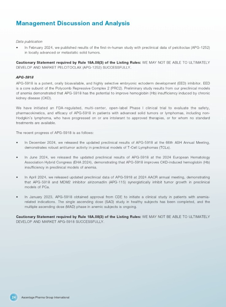 Ascentage Pharma Group International 24 Management Discussion and Analysis Data publication • In February 2024 , we published results of the first - in - human study with preclinical data of pelcitoclax (APG - 1252 ) in locally advanced or metastatic solid tumors . Cautionary Statement required by Rule 18 A . 08 ( 3 ) of the Listing Rules : WE MAY NOT BE ABLE TO ULTIMATELY DEVELOP AND MARKET PELCITOCLAX (APG - 1252 ) SUCCESSFULLY . APG - 5918 APG - 5918 is a potent, orally bioavailable, and highly selective embryonic ectoderm development (EED) inhibitor . EED is a core subunit of the Polycomb Repressive Complex 2 (PRC 2 ) . Preliminary study results from our preclinical models of anemia demonstrated that APG - 5918 has the potential to improve hemoglobin (Hb) insufficiency induced by chronic kidney disease (CKD) . We have initiated an FDA - regulated, multi - center, open - label Phase I clinical trial to evaluate the safety, pharmacokinetics, and efficacy of APG - 5918 in patients with advanced solid tumors or lymphomas, including non - Hodgkin ’ s lymphoma, who have progressed on or are intolerant to approved therapies, or for whom no standard treatments are available . The recent progress of APG - 5918 is as follows : • In December 2024 , we released the updated preclinical results of APG - 5918 at the 66 th ASH Annual Meeting, demonstrates robust antitumor activity in preclinical models of T - Cell Lymphomas (TCLs) . • In June 2024 , we released the updated preclinical results of APG - 5918 at the 2024 European Hematology Association Hybrid Congress (EHA 2024 ), demonstrating that APG - 5918 improves CKD - induced hemoglobin (Hb) insufficiency in preclinical models of anemia . • In April 2024 , we released updated preclinical data of APG - 5918 at 2024 AACR annual meeting, demonstrating that APG - 5918 and MDM 2 inhibitor alrizomadlin (APG - 115 ) synergistically inhibit tumor growth in preclinical models of PCa . • In January 2023 , APG - 5918 obtained approval from CDE to initiate a clinical study in patients with anemia - related indications . The single ascending dose (SAD) study in healthy subjects has been completed, and the multiple ascending dose (MAD) phase in anemic subjects is ongoing . Cautionary Statement required by Rule 18 A . 08 ( 3 ) of the Listing Rules : WE MAY NOT BE ABLE TO ULTIMATELY DEVELOP AND MARKET APG - 5918 SUCCESSFULLY .