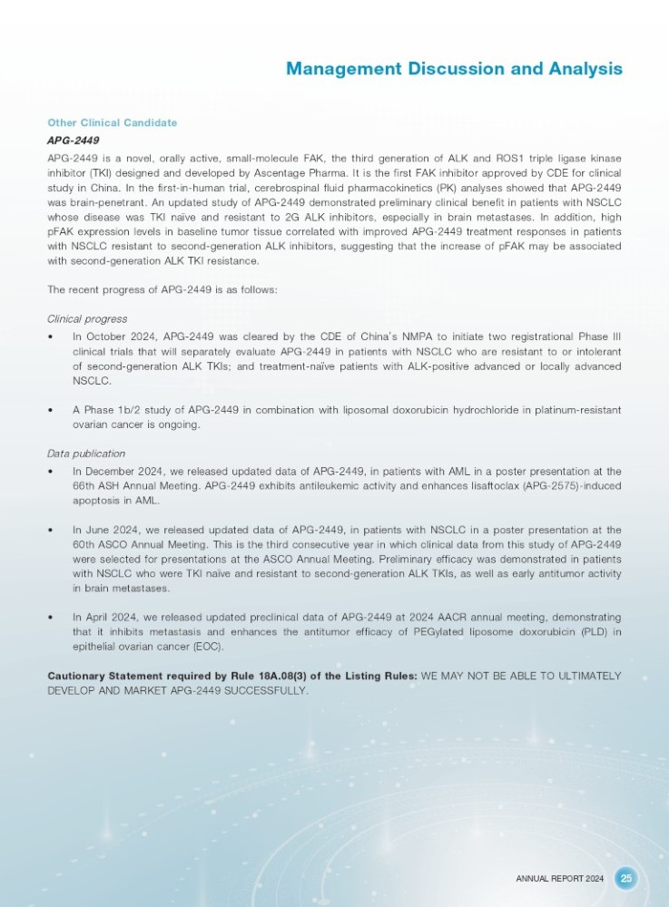 ANNUAL REPORT 2024 25 Management Discussion and Analysis Other Clinical Candidate APG - 2449 APG - 2449 is a novel, orally active, small - molecule FAK, the third generation of ALK and ROS 1 triple ligase kinase inhibitor (TKI) designed and developed by Ascentage Pharma . It is the first FAK inhibitor approved by CDE for clinical study in China . In the first - in - human trial, cerebrospinal fluid pharmacokinetics (PK) analyses showed that APG - 2449 was brain - penetrant . An updated study of APG - 2449 demonstrated preliminary clinical benefit in patients with NSCLC whose disease was TKI naïve and resistant to 2 G ALK inhibitors, especially in brain metastases . In addition, high pFAK expression levels in baseline tumor tissue correlated with improved APG - 2449 treatment responses in patients with NSCLC resistant to second - generation ALK inhibitors, suggesting that the increase of pFAK may be associated with second - generation ALK TKI resistance . The recent progress of APG - 2449 is as follows : Clinical progress • In October 2024 , APG - 2449 was cleared by the CDE of China ’ s NMPA to initiate two registrational Phase III clinical trials that will separately evaluate APG - 2449 in patients with NSCLC who are resistant to or intolerant of second - generation ALK TKIs ; and treatment - naïve patients with ALK - positive advanced or locally advanced NSCLC . • A Phase 1 b/ 2 study of APG - 2449 in combination with liposomal doxorubicin hydrochloride in platinum - resistant ovarian cancer is ongoing . Data publication • In December 2024 , we released updated data of APG - 2449 , in patients with AML in a poster presentation at the 66 th ASH Annual Meeting . APG - 2449 exhibits antileukemic activity and enhances lisaftoclax (APG - 2575 ) - induced apoptosis in AML . • In June 2024 , we released updated data of APG - 2449 , in patients with NSCLC in a poster presentation at the 60 th ASCO Annual Meeting . This is the third consecutive year in which clinical data from this study of APG - 2449 were selected for presentations at the ASCO Annual Meeting . Preliminary efficacy was demonstrated in patients with NSCLC who were TKI naïve and resistant to second - generation ALK TKIs, as well as early antitumor activity in brain metastases . • In April 2024 , we released updated preclinical data of APG - 2449 at 2024 AACR annual meeting, demonstrating that it inhibits metastasis and enhances the antitumor efficacy of PEGylated liposome doxorubicin (PLD) in epithelial ovarian cancer (EOC) . Cautionary Statement required by Rule 18 A . 08 ( 3 ) of the Listing Rules : WE MAY NOT BE ABLE TO ULTIMATELY DEVELOP AND MARKET APG - 2449 SUCCESSFULLY .