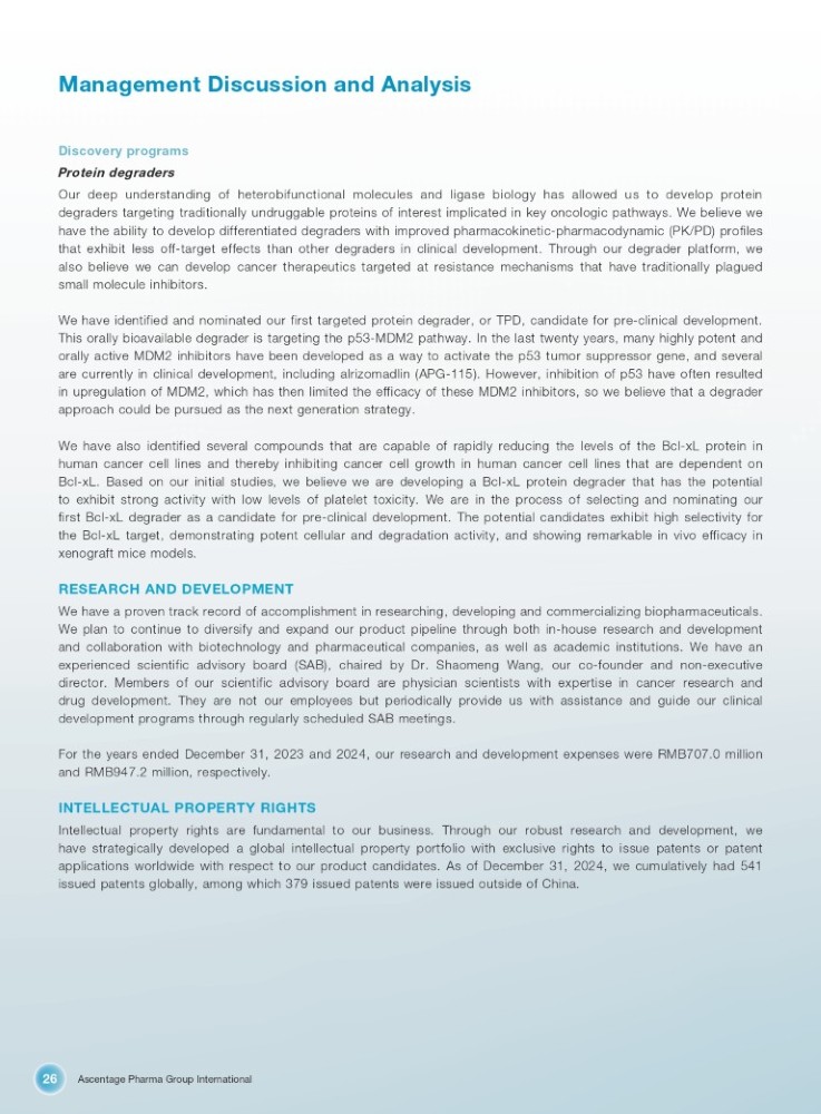 Ascentage Pharma Group International 26 Management Discussion and Analysis Discovery programs Protein degraders Our deep understanding of heterobifunctional molecules and ligase biology has allowed us to develop protein degraders targeting traditionally undruggable proteins of interest implicated in key oncologic pathways . We believe we have the ability to develop differentiated degraders with improved pharmacokinetic - pharmacodynamic (PK/PD) profiles that exhibit less off - target effects than other degraders in clinical development . Through our degrader platform, we also believe we can develop cancer therapeutics targeted at resistance mechanisms that have traditionally plagued small molecule inhibitors . We have identified and nominated our first targeted protein degrader, or TPD, candidate for pre - clinical development . This orally bioavailable degrader is targeting the p 53 - MDM 2 pathway . In the last twenty years, many highly potent and orally active MDM 2 inhibitors have been developed as a way to activate the p 53 tumor suppressor gene, and several are currently in clinical development, including alrizomadlin (APG - 115 ) . However, inhibition of p 53 have often resulted in upregulation of MDM 2 , which has then limited the efficacy of these MDM 2 inhibitors, so we believe that a degrader approach could be pursued as the next generation strategy . We have also identified several compounds that are capable of rapidly reducing the levels of the Bcl - xL protein in human cancer cell lines and thereby inhibiting cancer cell growth in human cancer cell lines that are dependent on Bcl - xL . Based on our initial studies, we believe we are developing a Bcl - xL protein degrader that has the potential to exhibit strong activity with low levels of platelet toxicity . We are in the process of selecting and nominating our first Bcl - xL degrader as a candidate for pre - clinical development . The potential candidates exhibit high selectivity for the Bcl - xL target, demonstrating potent cellular and degradation activity, and showing remarkable in vivo efficacy in xenograft mice models . RESEARCH AND DEVELOPMENT We have a proven track record of accomplishment in researching, developing and commercializing biopharmaceuticals . We plan to continue to diversify and expand our product pipeline through both in - house research and development and collaboration with biotechnology and pharmaceutical companies, as well as academic institutions . We have an experienced scientific advisory board (SAB), chaired by Dr . Shaomeng Wang, our co - founder and non - executive director . Members of our scientific advisory board are physician scientists with expertise in cancer research and drug development . They are not our employees but periodically provide us with assistance and guide our clinical development programs through regularly scheduled SAB meetings . For the years ended December 31 , 2023 and 2024 , our research and development expenses were RMB 707 . 0 million and RMB 947 . 2 million, respectively . INTELLECTUAL PROPERTY RIGHTS Intellectual property rights are fundamental to our business . Through our robust research and development, we have strategically developed a global intellectual property portfolio with exclusive rights to issue patents or patent applications worldwide with respect to our product candidates . As of December 31 , 2024 , we cumulatively had 541 issued patents globally, among which 379 issued patents were issued outside of China .