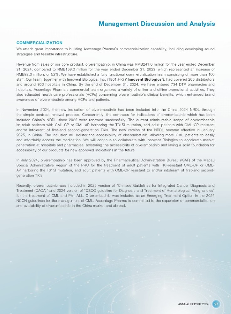 ANNUAL REPORT 2024 27 Management Discussion and Analysis COMMERCIALIZATION We attach great importance to building Ascentage Pharma ’ s commercialization capability, including developing sound strategies and feasible infrastructure . Revenue from sales of our core product, olverembatinib, in China was RMB 241 . 0 million for the year ended December 31 , 2024 , compared to RMB 159 . 0 million for the year ended December 31 , 2023 , which represented an increase of RMB 82 . 0 million, or 52 % . We have established a fully functional commercialization team consisting of more than 100 staff . Our team, together with Innovent Biologics, Inc . ( 1801 . HK) ( “ Innovent Biologics ” ), had covered 265 distributors and around 800 hospitals in China . By the end of December 31 , 2024 , we have entered 734 DTP pharmacies and hospitals . Ascentage Pharma ’ s commercial team organized a variety of online and offline promotional activities . They also educated health care professionals (HCPs) concerning olverembatinib ’ s clinical benefits, which enhanced brand awareness of olverembatinib among HCPs and patients . In November 2024 , the new indication of olverembatinib has been included into the China 2024 NRDL through the simple contract renewal process . Concurrently, the contracts for indications of olverembatinib which has been included China ’ s NRDL since 2022 were renewed successfully . The current reimbursable scope of olverembatinib is : adult patients with CML - CP or CML - AP harboring the T 315 I mutation, and adult patients with CML - CP resistant and/or intolerant of first - and second - generation TKIs . The new version of the NRDL became effective in January 2025 , in China . The inclusion will bolster the accessibility of olverembatinib, allowing more CML patients to easily and affordably access the medication . We will continue to collaborate with Innovent Biologics to accelerate market penetration at hospitals and pharmacies, bolstering the accessibility of olverembatinib and laying a solid foundation for accessibility of our products for new approved indications in the future . In July 2024 , olverembatinib has been approved by the Pharmaceutical Administration Bureau (ISAF) of the Macau Special Administrative Region of the PRC for the treatment of adult patients with TKI - resistant CML - CP or CML - AP harboring the T 315 I mutation ; and adult patients with CML - CP resistant to and/or intolerant of first - and second - generation TKIs . Recently, olverembatinib was included in 2025 version of “ Chinese Guidelines for Integrated Cancer Diagnosis and Treatment (CACA) ” and 2024 version of “ CSCO guideline for Diagnosis and Treatment of Hematological Malignancies ” for the treatment of CML and Ph+ ALL . Olverembatinib was included as an Emerging Treatment Option in the 2024 NCCN guidelines for the management of CML . Ascentage Pharma is committed to the expansion of commercialization and availability of olverembatinib in the China market and abroad .