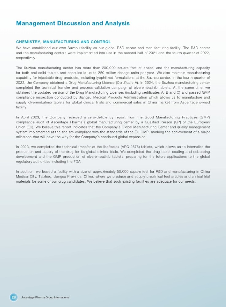 Ascentage Pharma Group International 28 Management Discussion and Analysis CHEMISTRY, MANUFACTURING AND CONTROL We have established our own Suzhou facility as our global R&D center and manufacturing facility . The R&D center and the manufacturing centers were implemented into use in the second half of 2021 and the fourth quarter of 2022 , respectively . The Suzhou manufacturing center has more than 200 , 000 square feet of space, and the manufacturing capacity for both oral solid tablets and capsules is up to 250 million dosage units per year . We also maintain manufacturing capability for injectable drug products, including lyophilized formulations at the Suzhou center . In the fourth quarter of 2022 , the Company obtained a Drug Manufacturing License (Certificate A) . In 2024 , the Suzhou manufacturing center completed the technical transfer and process validation campaign of olverembatinib tablets . At the same time, we obtained the updated version of the Drug Manufacturing Licenses (including certificates A, B and C) and passed GMP compliance inspection conducted by Jiangsu Medical Products Administration which allows us to manufacture and supply olverembatinib tablets for global clinical trials and commercial sales in China market from Ascentage owned facility . In April 2023 , the Company received a zero - deficiency report from the Good Manufacturing Practices (GMP) compliance audit of Ascentage Pharma ’ s global manufacturing center by a Qualified Person (QP) of the European Union (EU) . We believe this report indicates that the Company ’ s Global Manufacturing Center and quality management system implemented at the site are compliant with the standards of the EU GMP, marking the achievement of a major milestone that will pave the way for the Company ’ s continued global expansion . In 2023 , we completed the technical transfer of the lisaftoclax (APG - 2575 ) tablets, which allows us to internalize the production and supply of the drug for its global clinical trials . We completed the drug tablet coating and debossing development and the GMP production of olverembatinib tablets, preparing for the future applications to the global regulatory authorities including the FDA . In addition, we leased a facility with a size of approximately 50 , 000 square feet for R&D and manufacturing in China Medical City, Taizhou, Jiangsu Province, China, where we produce and supply preclinical test articles and clinical trial materials for some of our drug candidates . We believe that such existing facilities are adequate for our needs .