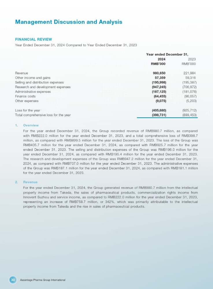 Ascentage Pharma Group International 30 Management Discussion and Analysis FINANCIAL REVIEW Year Ended December 31, 2024 Compared to Year Ended December 31, 2023 Year ended December 31, 2023 RMB ’ 000 2024 RMB ’ 000 221,984 980,650 Revenue 59,316 57,359 Other income and gains (195,387) (195,998) Selling and distribution expenses (706,972) (947,245) Research and development expenses (181,076) (187,125) Administrative expenses (96,057) (64,455) Finance costs (5,203) (9,075) Other expenses (925,712) (405,680) Loss for the year (899,453) (398,731) Total comprehensive loss for the year 1. Overview as compared of RMB980.7 million, 31, 2024, the Group recorded revenue For the year ended December with RMB 222 . 0 million for the year ended December 31 , 2023 , and a total comprehensive loss of RMB 398 . 7 million, as compared with RMB 899 . 5 million for the year ended December 31 , 2023 . The loss of the Group was RMB 405 . 7 million for the year ended December 31 , 2024 , as compared with RMB 925 . 7 million for the year ended December 31 , 2023 . The selling and distribution expenses of the Group was RMB 196 . 0 million for the year ended December 31 , 2024 , as compared with RMB 195 . 4 million for the year ended December 31 , 2023 . The research and development expenses of the Group was RMB 947 . 2 million for the year ended December 31 , 2024 , as compared with RMB 707 . 0 million for the year ended December 31 , 2023 . The administrative expenses of the Group was RMB 187 . 1 million for the year ended December 31 , 2024 , as compared with RMB 181 . 1 million for the year ended December 31 , 2023 . 2. Revenue For the year ended December 31 , 2024 , the Group generated revenue of RMB 980 . 7 million from the intellectual property income from Takeda, the sales of pharmaceutical products, commercialization rights income from Innovent Suzhou and service income, as compared to RMB 222 . 0 million for the year ended December 31 , 2023 , representing an increase of RMB 758 . 7 million, or 342 % , which was primarily attributable to the intellectual property income from Takeda and the rise in sales of pharmaceutical products .