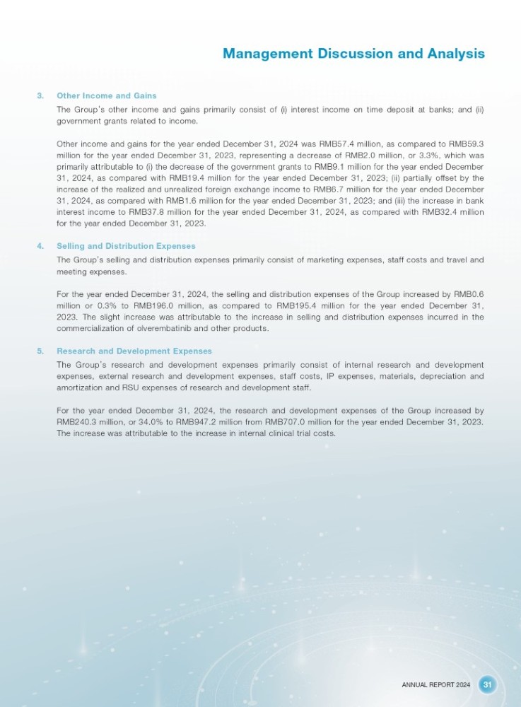 ANNUAL REPORT 2024 31 Management Discussion and Analysis 3. Other Income and Gains The Group ’ s other income and gains primarily consist of (i) interest income on time deposit at banks ; and (ii) government grants related to income . Other income and gains for the year ended December 31 , 2024 was RMB 57 . 4 million, as compared to RMB 59 . 3 million for the year ended December 31 , 2023 , representing a decrease of RMB 2 . 0 million, or 3 . 3 % , which was primarily attributable to (i) the decrease of the government grants to RMB 9 . 1 million for the year ended December 31 , 2024 , as compared with RMB 19 . 4 million for the year ended December 31 , 2023 ; (ii) partially offset by the increase of the realized and unrealized foreign exchange income to RMB 6 . 7 million for the year ended December 31 , 2024 , as compared with RMB 1 . 6 million for the year ended December 31 , 2023 ; and (iii) the increase in bank interest income to RMB 37 . 8 million for the year ended December 31 , 2024 , as compared with RMB 32 . 4 million for the year ended December 31 , 2023 . 4. Selling and Distribution Expenses The Group ’ s selling and distribution expenses primarily consist of marketing expenses, staff costs and travel and meeting expenses . For the year ended December 31 , 2024 , the selling and distribution expenses of the Group increased by RMB 0 . 6 million or 0 . 3 % to RMB 196 . 0 million, as compared to RMB 195 . 4 million for the year ended December 31 , 2023 . The slight increase was attributable to the increase in selling and distribution expenses incurred in the commercialization of olverembatinib and other products . 5. Research and Development Expenses The Group ’ s research and development expenses primarily consist of internal research and development expenses, external research and development expenses, staff costs, IP expenses, materials, depreciation and amortization and RSU expenses of research and development staff . For the year ended December 31 , 2024 , the research and development expenses of the Group increased by RMB 240 . 3 million, or 34 . 0 % to RMB 947 . 2 million from RMB 707 . 0 million for the year ended December 31 , 2023 . The increase was attributable to the increase in internal clinical trial costs .