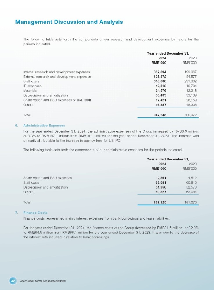 Ascentage Pharma Group International 32 Management Discussion and Analysis The following table sets forth the components of our research and development expenses by nature for the periods indicated. Year ended December 31, 2023 RMB ’ 000 2024 RMB ’ 000 199,967 367,894 Internal research and development expenses 84,577 125,872 External research and development expenses 291,902 318,638 Staff costs 10,704 12,518 IP expenses 12,218 24,576 Materials 33,139 33,439 Depreciation and amortization 26,159 17,421 Share option and RSU expenses of R&D staff 48,306 46,887 Others 706,972 947,245 Total 6. Administrative Expenses For the year ended December 31 , 2024 , the administrative expenses of the Group increased by RMB 6 . 0 million, or 3 . 3 % to RMB 187 . 1 million from RMB 181 . 1 million for the year ended December 31 , 2023 . The increase was primarily attributable to the increase in agency fees for US IPO . The following table sets forth the components of our administrative expenses for the periods indicated . Year ended December 31, 2023 RMB ’ 000 2024 RMB ’ 000 4,512 2,861 Share option and RSU expenses 60,910 63,081 Staff costs 52,570 51,356 Depreciation and amortization 63,084 69,827 Others 181,076 187,125 Total 7. Finance Costs Finance costs represented mainly interest expenses from bank borrowings and lease liabilities . For the year ended December 31 , 2024 , the finance costs of the Group decreased by RMB 31 . 6 million, or 32 . 9 % to RMB 64 . 5 million from RMB 96 . 1 million for the year ended December 31 , 2023 . It was due to the decrease of the interest rate incurred in relation to bank borrowings .