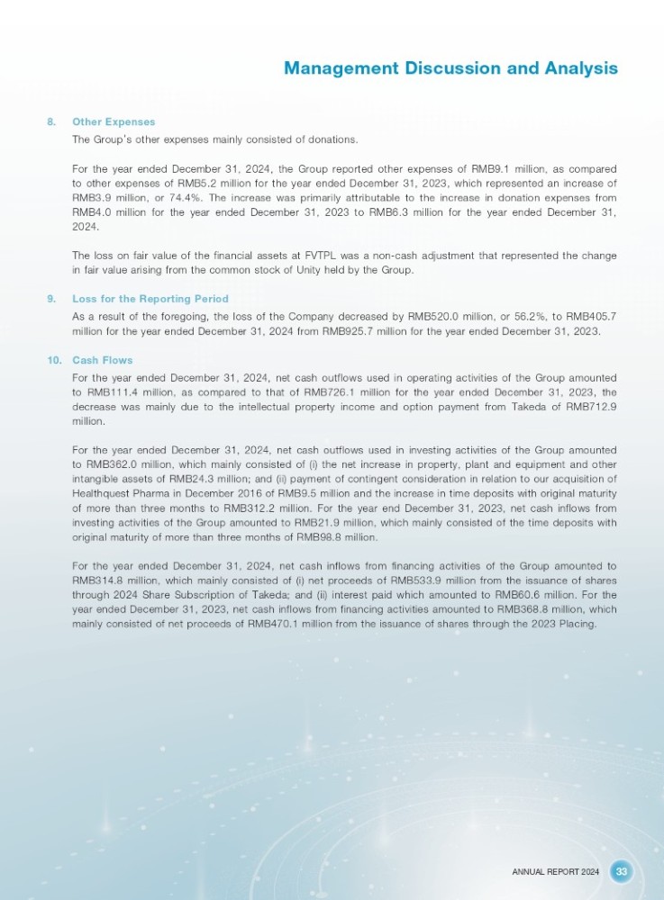 ANNUAL REPORT 2024 33 Management Discussion and Analysis 8. Other Expenses The Group ’ s other expenses mainly consisted of donations . For the year ended December 31 , 2024 , the Group reported other expenses of RMB 9 . 1 million, as compared to other expenses of RMB 5 . 2 million for the year ended December 31 , 2023 , which represented an increase of RMB 3 . 9 million, or 74 . 4 % . The increase was primarily attributable to the increase in donation expenses from RMB 4 . 0 million for the year ended December 31 , 2023 to RMB 6 . 3 million for the year ended December 31 , 2024 . The loss on fair value of the financial assets at FVTPL was a non - cash adjustment that represented the change in fair value arising from the common stock of Unity held by the Group . 9. Loss for the Reporting Period As a result of the foregoing, the loss of the Company decreased by RMB 520 . 0 million, or 56 . 2 % , to RMB 405 . 7 million for the year ended December 31 , 2024 from RMB 925 . 7 million for the year ended December 31 , 2023 . 10. Cash Flows For the year ended December 31 , 2024 , net cash outflows used in operating activities of the Group amounted to RMB 111 . 4 million, as compared to that of RMB 726 . 1 million for the year ended December 31 , 2023 , the decrease was mainly due to the intellectual property income and option payment from Takeda of RMB 712 . 9 million . For the year ended December 31 , 2024 , net cash outflows used in investing activities of the Group amounted to RMB 362 . 0 million, which mainly consisted of (i) the net increase in property, plant and equipment and other intangible assets of RMB 24 . 3 million ; and (ii) payment of contingent consideration in relation to our acquisition of Healthquest Pharma in December 2016 of RMB 9 . 5 million and the increase in time deposits with original maturity of more than three months to RMB 312 . 2 million . For the year end December 31 , 2023 , net cash inflows from investing activities of the Group amounted to RMB 21 . 9 million, which mainly consisted of the time deposits with original maturity of more than three months of RMB 98 . 8 million . For the year ended December 31 , 2024 , net cash inflows from financing activities of the Group amounted to RMB 314 . 8 million, which mainly consisted of (i) net proceeds of RMB 533 . 9 million from the issuance of shares through 2024 Share Subscription of Takeda ; and (ii) interest paid which amounted to RMB 60 . 6 million . For the year ended December 31 , 2023 , net cash inflows from financing activities amounted to RMB 368 . 8 million, which mainly consisted of net proceeds of RMB 470 . 1 million from the issuance of shares through the 2023 Placing .