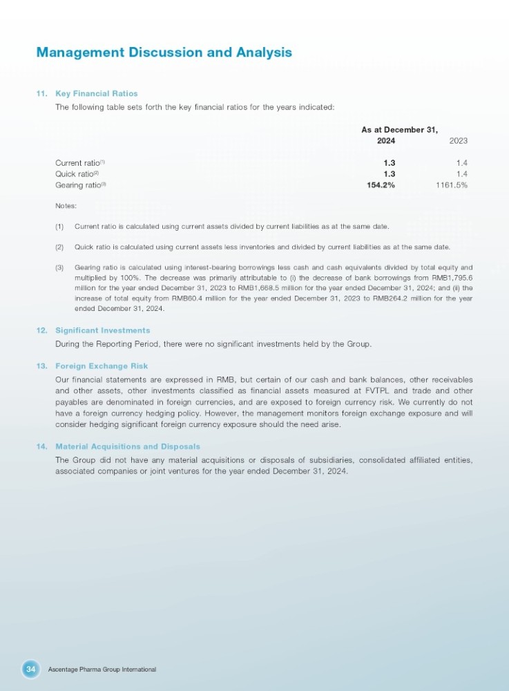 Ascentage Pharma Group International 34 Management Discussion and Analysis 11. Key Financial Ratios The following table sets forth the key financial ratios for the years indicated: As at December 31, 2023 2024 1.4 1.3 Current ratio (1) 1.4 1.3 Quick ratio (2) 1161.5% 154.2% Gearing ratio (3) Notes: (1) Current ratio is calculated using current assets divided by current liabilities as at the same date. (2) Quick ratio is calculated using current assets less inventories and divided by current liabilities as at the same date. (3) Gearing ratio is calculated using interest - bearing borrowings less cash and cash equivalents divided by total equity and multiplied by 100 % . The decrease was primarily attributable to (i) the decrease of bank borrowings from RMB 1 , 795 . 6 million for the year ended December 31 , 2023 to RMB 1 , 668 . 5 million for the year ended December 31 , 2024 ; and (ii) the increase of total equity from RMB 60 . 4 million for the year ended December 31 , 2023 to RMB 264 . 2 million for the year ended December 31 , 2024 . 12. Significant Investments During the Reporting Period, there were no significant investments held by the Group . 13. Foreign Exchange Risk Our financial statements are expressed in RMB, but certain of our cash and bank balances, other receivables and other assets, other investments classified as financial assets measured at FVTPL and trade and other payables are denominated in foreign currencies, and are exposed to foreign currency risk . We currently do not have a foreign currency hedging policy . However, the management monitors foreign exchange exposure and will consider hedging significant foreign currency exposure should the need arise . 14. Material Acquisitions and Disposals The Group did not have any material acquisitions or disposals of subsidiaries, consolidated affiliated entities, associated companies or joint ventures for the year ended December 31 , 2024 .