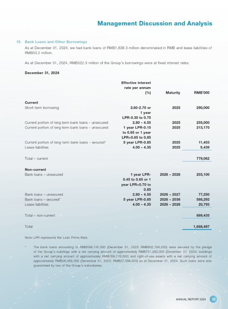 ANNUAL REPORT 2024 35 Management Discussion and Analysis 15. Bank Loans and Other Borrowings As at December 31, 2024, we had bank loans of RMB1,638.3 million denominated in RMB and lease liabilities of RMB30.2 million. As at December 31, 2024, RMB522.3 million of the Group ’ s borrowings were at fixed interest rates. December 31, 2024 Effective interest RMB ’ 000 Maturity rate per annum (%) Current 290,000 2025 2.60 - 2.70 or Short - term borrowing 1 year LPR - 0.30 to 0.75 255,000 2025 2.80 – 4.55 Current portion of long term bank loans – unsecured 213,170 2025 1 year LPR - 0.15 Current portion of long term bank loans – unsecured to 0.65 or 1 year LPR+0.65 to 0.85 11,453 2025 5 year LPR - 0.85 Current portion of long - term bank loans – secured* 9,439 2025 4.00 – 4.35 Lease liabilities 779,062 Total – current 203,100 2026 – 2028 1 year LPR - Non - current Bank loans – unsecured 0.45 to 0.65 or 1 year LPR+0.70 to 0.85 77,250 2026 – 2027 2.80 – 4.50 Bank loans – unsecured 588,292 2026 – 2038 5 year LPR - 0.85 Bank loans – secured* 20,793 2026 – 2028 4.00 – 4.35 Lease liabilities 889,435 Total – non - current 1,668,497 Total Note: LPR represents the Loan Prime Rate. * The bank loans amounting to RMB 599 , 745 , 000 (December 31 , 2023 : RMB 602 , 794 , 000 ) were secured by the pledge of the Group ’ s buildings with a net carrying amount of approximately RMB 731 , 282 , 000 (December 31 , 2023 : buildings with a net carrying amount of approximately RMB 769 , 776 , 000 ) and right - of - use assets with a net carrying amount of approximately RMB 26 , 468 , 000 (December 31 , 2023 : RMB 27 , 598 , 000 ) as at December 31 , 2024 . Such loans were also guaranteed by two of the Group ’ s subsidiaries .