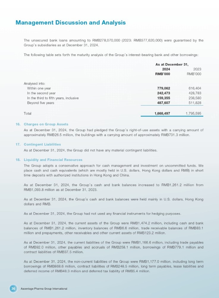 Ascentage Pharma Group International 36 Management Discussion and Analysis The unsecured bank loans amounting to RMB278,070,000 (2023: RMB377,620,000) were guaranteed by the Group ’ s subsidiaries as at December 31, 2024. The following table sets forth the maturity analysis of the Group ’ s interest - bearing bank and other borrowings: As at December 31, 2024 2023 RMB ’ 000 RMB ’ 000 Analysed into: 616,404 779,062 Within one year 428,783 242,473 In the second year 238,580 159,355 In the third to fifth years, inclusive 511,828 487,607 Beyond five years 1,795,595 1,668,497 Total 16. Charges on Group Assets As at December 31 , 2024 , the Group had pledged the Group ’ s right - of - use assets with a carrying amount of approximately RMB 26 . 5 million, the buildings with a carrying amount of approximately RMB 731 . 3 million . 17. Contingent Liabilities As at December 31 , 2024 , the Group did not have any material contingent liabilities . 18. Liquidity and Financial Resources The Group adopts a conservative approach for cash management and investment on uncommitted funds . We place cash and cash equivalents (which are mostly held in U . S . dollars, Hong Kong dollars and RMB) in short time deposits with authorized institutions in Hong Kong and China . As at December 31 , 2024 , the Group ’ s cash and bank balances increased to RMB 1 , 261 . 2 million from RMB 1 , 093 . 8 million as at December 31 , 2023 . As at December 31 , 2024 , the Group ’ s cash and bank balances were held mainly in U . S . dollars, Hong Kong dollars and RMB . As at December 31 , 2024 , the Group had not used any financial instruments for hedging purposes . As at December 31 , 2024 , the current assets of the Group were RMB 1 , 474 . 2 million, including cash and bank balances of RMB 1 , 261 . 2 million, inventory balances of RMB 6 . 6 million, trade receivable balances of RMB 83 . 1 million and prepayments, other receivables and other current assets of RMB 123 . 2 million . As at December 31 , 2024 , the current liabilities of the Group were RMB 1 , 166 . 6 million, including trade payables of RMB 92 . 0 million, other payables and accruals of RMB 258 . 1 million, borrowings of RMB 779 . 1 million and contract liabilities of RMB 37 . 5 million . As at December 31 , 2024 , the non - current liabilities of the Group were RMB 1 , 177 . 0 million, including long term borrowings of RMB 868 . 6 million, contract liabilities of RMB 248 . 5 million, long term payables, lease liabilities and deferred income of RMB 48 . 3 million and deferred tax liability of RMB 5 . 4 million .