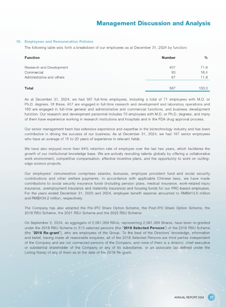ANNUAL REPORT 2024 37 Management Discussion and Analysis 19. Employees and Remuneration Policies The following table sets forth a breakdown of our employees as at December 31, 2024 by function: Function Number % Research and Development Commercial Administrative and others 407 93 67 71.8 16.4 11.8 Total 567 100 . 0 As at December 31 , 2024 , we had 567 full - time employees, including a total of 71 employees with M . D . or Ph . D . degrees . Of these, 407 are engaged in full - time research and development and laboratory operations and 160 are engaged in full - time general and administrative and commercial functions, and business development function . Our research and development personnel includes 70 employees with M . D . or Ph . D . degrees, and many of them have experience working in research institutions and hospitals and in the FDA drug approval process . Our senior management team has extensive experience and expertise in the biotechnology industry and has been contributive in driving the success of our business . As at December 31 , 2024 , we had 187 senior employees who have an average of 15 to 20 years of experience in relevant fields . We have also enjoyed more than 84 % retention rate of employee over the last two years, which facilitates the growth of our institutional knowledge base . We are actively recruiting talents globally by offering a collaborative work environment, competitive compensation, effective incentive plans, and the opportunity to work on cutting - edge science projects . Our employees ’ remuneration comprises salaries, bonuses, employee provident fund and social security contributions and other welfare payments . In accordance with applicable Chinese laws, we have made contributions to social security insurance funds (including pension plans, medical insurance, work - related injury insurance, unemployment insurance and maternity insurance) and housing funds for our PRC - based employees . For the years ended December 31 , 2023 and 2024 , employee benefit expense amounted to RMB 413 . 0 million and RMB 434 . 2 million, respectively . The Company has also adopted the Pre - IPO Share Option Scheme, the Post - IPO Share Option Scheme, the 2018 RSU Scheme, the 2021 RSU Scheme and the 2022 RSU Scheme . On September 2 , 2024 , an aggregate of 2 , 081 , 399 RSUs, representing 2 , 081 , 399 Shares, have been re - granted under the 2018 RSU Scheme to 513 selected persons (the “ 2018 Selected Persons ” ) of the 2018 RSU Scheme (the “ 2018 Re - grant ” ), who are employees of the Group . To the best of the Directors ’ knowledge, information and belief, having made all reasonable enquiries, all of the 2018 Selected Persons are third parties independent of the Company and are not connected persons of the Company, and none of them is a director, chief executive or substantial shareholder of the Company or any of its subsidiaries, or an associate (as defined under the Listing Rules) of any of them as at the date of the 2018 Re - grant .