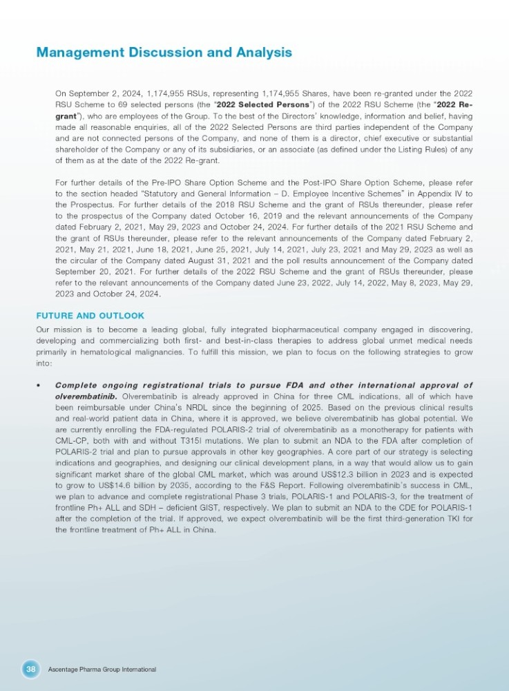 Ascentage Pharma Group International 38 Management Discussion and Analysis On September 2 , 2024 , 1 , 174 , 955 RSUs, representing 1 , 174 , 955 Shares, have been re - granted under the 2022 RSU Scheme to 69 selected persons (the “ 2022 Selected Persons ” ) of the 2022 RSU Scheme (the “ 2022 Re - grant ” ), who are employees of the Group . To the best of the Directors ’ knowledge, information and belief, having made all reasonable enquiries, all of the 2022 Selected Persons are third parties independent of the Company and are not connected persons of the Company, and none of them is a director, chief executive or substantial shareholder of the Company or any of its subsidiaries, or an associate (as defined under the Listing Rules) of any of them as at the date of the 2022 Re - grant . For further details of the Pre - IPO Share Option Scheme and the Post - IPO Share Option Scheme, please refer to the section headed “ Statutory and General Information – D . Employee Incentive Schemes ” in Appendix IV to the Prospectus . For further details of the 2018 RSU Scheme and the grant of RSUs thereunder, please refer to the prospectus of the Company dated October 16 , 2019 and the relevant announcements of the Company dated February 2 , 2021 , May 29 , 2023 and October 24 , 2024 . For further details of the 2021 RSU Scheme and the grant of RSUs thereunder, please refer to the relevant announcements of the Company dated February 2 , 2021 , May 21 , 2021 , June 18 , 2021 , June 25 , 2021 , July 14 , 2021 , July 23 , 2021 and May 29 , 2023 as well as the circular of the Company dated August 31 , 2021 and the poll results announcement of the Company dated September 20 , 2021 . For further details of the 2022 RSU Scheme and the grant of RSUs thereunder, please refer to the relevant announcements of the Company dated June 23 , 2022 , July 14 , 2022 , May 8 , 2023 , May 29 , 2023 and October 24 , 2024 . FUTURE AND OUTLOOK Our mission is to become a leading global, fully integrated biopharmaceutical company engaged in discovering, developing and commercializing both first - and best - in - class therapies to address global unmet medical needs primarily in hematological malignancies . To fulfill this mission, we plan to focus on the following strategies to grow into : • Complete ongoing registrational trials to pursue FDA and other international approval of olverembatinib . Olverembatinib is already approved in China for three CML indications, all of which have been reimbursable under China ’ s NRDL since the beginning of 2025 . Based on the previous clinical results and real - world patient data in China, where it is approved, we believe olverembatinib has global potential . We are currently enrolling the FDA - regulated POLARIS - 2 trial of olverembatinib as a monotherapy for patients with CML - CP, both with and without T 315 I mutations . We plan to submit an NDA to the FDA after completion of POLARIS - 2 trial and plan to pursue approvals in other key geographies . A core part of our strategy is selecting indications and geographies, and designing our clinical development plans, in a way that would allow us to gain significant market share of the global CML market, which was around US $ 12 . 3 billion in 2023 and is expected to grow to US $ 14 . 6 billion by 2035 , according to the F&S Report . Following olverembatinib ’ s success in CML, we plan to advance and complete registrational Phase 3 trials, POLARIS - 1 and POLARIS - 3 , for the treatment of frontline Ph+ ALL and SDH – deficient GIST, respectively . We plan to submit an NDA to the CDE for POLARIS - 1 after the completion of the trial . If approved, we expect olverembatinib will be the first third - generation TKI for the frontline treatment of Ph+ ALL in China .