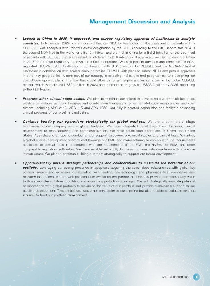 ANNUAL REPORT 2024 39 Management Discussion and Analysis • Launch in China in 2025 , if approved, and pursue regulatory approval of lisaftoclax in multiple countries . In November 2024 , we announced that our NDA for lisaftoclax for the treatment of patients with r/ r CLL/SLL was accepted with Priority Review designation by the CDE . According to the F&S Report, this NDA is the second NDA filed in the world for a Bcl - 2 inhibitor and the first in China for a Bcl - 2 inhibitor for the treatment of patients with CLL/SLL that are resistant or intolerant to BTK inhibitors . If approved, we plan to launch in China in 2025 and pursue regulatory approvals in multiple countries . We also plan to advance and complete the FDA - regulated GLORA trial of lisaftoclax in combination with BTK inhibitors for CLL/SLL and the GLORA - 2 trial of lisaftoclax in combination with acalabrutinib in frontline CLL/SLL with plans to submit NDAs and pursue approvals in other key geographies . A core part of our strategy is selecting indications and geographies, and designing our clinical development plans, in a way that would allow us to gain significant market share in the global CLL/SLL market, which was around US $ 9 . 4 billion in 2023 and is expected to grow to US $ 38 . 2 billion by 2035 , according to the F&S Report . • Progress other clinical stage assets . We plan to continue our efforts in developing our other clinical stage pipeline candidates as monotherapies and combination therapies in other hematological malignancies and solid tumors, including APG - 2449 , APG - 115 and APG - 1252 . Our fully - integrated capabilities can facilitate advancing clinical progress of our pipeline candidates . • Continue building our operations strategically for global markets . We are a commercial stage biopharmaceutical company with a global footprint . We have integrated capabilities from discovery, clinical development to manufacturing and commercialization . We have established operations in China, the United States, Australia and Europe to conduct and/or support discovery, preclinical studies and clinical trials . We adopt a global clinical development strategy and leverage our CMC and manufacturing to comply with the requirements applicable to clinical trials in accordance with the requirements of the FDA, the NMPA, the EMA, and other comparable regulatory authorities . We have established a fully functional commercialization team with a feasible infrastructure . We plan to continue building our team strategically to support our future development . • Opportunistically pursue strategic partnerships and collaborations to maximize the potential of our portfolio . Leveraging our strong presence in apoptosis targeting therapies, deep relationships with global key opinion leaders and extensive collaboration with leading bio - technology and pharmaceutical companies and research institutions, we are well positioned to evolve as the partner of choice to provide complementary value to those with the ambition in building and expanding portfolio advantages . We will strategically evaluate potential collaborations with global partners to maximize the value of our portfolio and provide sustainable support to our pipeline development . These initiatives would not only optimize our pipeline but also provide sustainable revenue streams to fund our portfolio development .