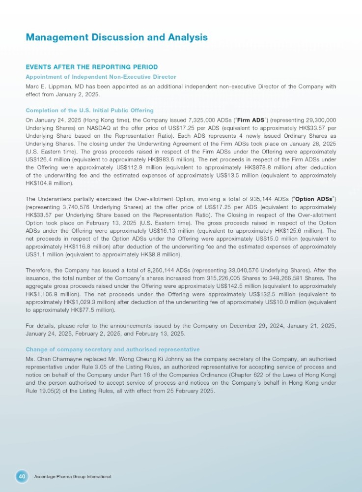 Ascentage Pharma Group International 40 Management Discussion and Analysis EVENTS AFTER THE REPORTING PERIOD Appointment of Independent Non - Executive Director Marc E . Lippman, MD has been appointed as an additional independent non - executive Director of the Company with effect from January 2 , 2025 . Completion of the U.S. Initial Public Offering On January 24 , 2025 (Hong Kong time), the Company issued 7 , 325 , 000 ADSs ( “ Firm ADS ” ) (representing 29 , 300 , 000 Underlying Shares) on NASDAQ at the offer price of US $ 17 . 25 per ADS (equivalent to approximately HK $ 33 . 57 per Underlying Share based on the Representation Ratio) . Each ADS represents 4 newly issued Ordinary Shares as Underlying Shares . The closing under the Underwriting Agreement of the Firm ADSs took place on January 28 , 2025 (U . S . Eastern time) . The gross proceeds raised in respect of the Firm ADSs under the Offering were approximately US $ 126 . 4 million (equivalent to approximately HK $ 983 . 6 million) . The net proceeds in respect of the Firm ADSs under the Offering were approximately US $ 112 . 9 million (equivalent to approximately HK $ 878 . 8 million) after deduction of the underwriting fee and the estimated expenses of approximately US $ 13 . 5 million (equivalent to approximately HK $ 104 . 8 million) . The Underwriters partially exercised the Over - allotment Option, involving a total of 935 , 144 ADSs ( “ Option ADSs ” ) (representing 3 , 740 , 576 Underlying Shares) at the offer price of US $ 17 . 25 per ADS (equivalent to approximately HK $ 33 . 57 per Underlying Share based on the Representation Ratio) . The Closing in respect of the Over - allotment Option took place on February 13 , 2025 (U . S . Eastern time) . The gross proceeds raised in respect of the Option ADSs under the Offering were approximately US $ 16 . 13 million (equivalent to approximately HK $ 125 . 6 million) . The net proceeds in respect of the Option ADSs under the Offering were approximately US $ 15 . 0 million (equivalent to approximately HK $ 116 . 8 million) after deduction of the underwriting fee and the estimated expenses of approximately US $ 1 . 1 million (equivalent to approximately HK $ 8 . 8 million) . Therefore, the Company has issued a total of 8 , 260 , 144 ADSs (representing 33 , 040 , 576 Underlying Shares) . After the issuance, the total number of the Company ’ s shares increased from 315 , 226 , 005 Shares to 348 , 266 , 581 Shares . The aggregate gross proceeds raised under the Offering were approximately US $ 142 . 5 million (equivalent to approximately HK $ 1 , 106 . 8 million) . The net proceeds under the Offering were approximately US $ 132 . 5 million (equivalent to approximately HK $ 1 , 029 . 3 million) after deduction of the underwriting fee of approximately US $ 10 . 0 million (equivalent to approximately HK $ 77 . 5 million) . For details, please refer to the announcements issued by the Company on December 29 , 2024 , January 21 , 2025 , January 24 , 2025 , February 2 , 2025 , and February 13 , 2025 . Change of company secretary and authorised representative Ms . Chan Charmayne replaced Mr . Wong Cheung Ki Johnny as the company secretary of the Company, an authorised representative under Rule 3 . 05 of the Listing Rules, an authorized representative for accepting service of process and notice on behalf of the Company under Part 16 of the Companies Ordinance (Chapter 622 of the Laws of Hong Kong) and the person authorised to accept service of process and notices on the Company ’ s behalf in Hong Kong under Rule 19 . 05 ( 2 ) of the Listing Rules, all with effect from 25 February 2025 .