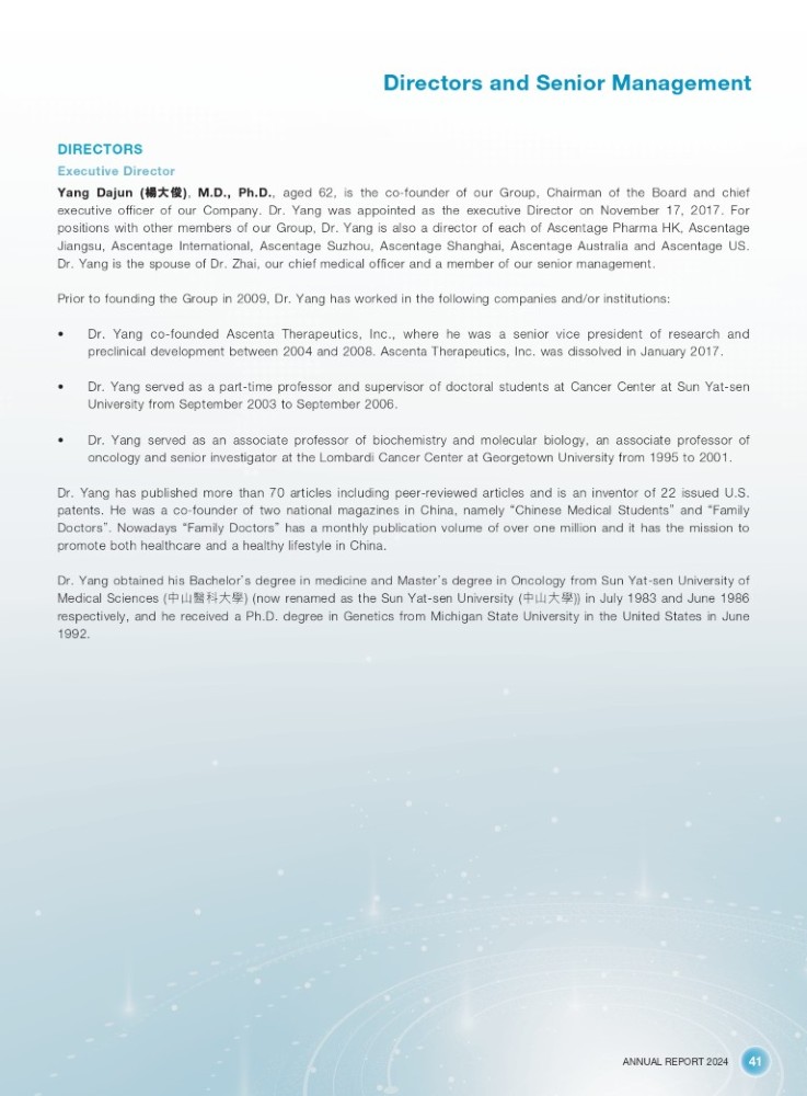 ANNUAL REPORT 2024 41 Directors and Senior Management DIRECTORS Executive Director Yang Dajun ( ὺབྷ׺ ) , M . D . , Ph . D . , aged 62 , is the co - founder of our Group , Chairman of the Board and chief executive officer of our Company . Dr . Yang was appointed as the executive Director on November 17 , 2017 . For positions with other members of our Group , Dr . Yang is also a director of each of Ascentage Pharma HK , Ascentage Jiangsu , Ascentage International , Ascentage Suzhou , Ascentage Shanghai , Ascentage Australia and Ascentage US . Dr . Yang is the spouse of Dr . Zhai , our chief medical officer and a member of our senior management . Prior to founding the Group in 2009 , Dr . Yang has worked in the following companies and/or institutions : • Dr. Yang co - founded Ascenta Therapeutics, Inc., where he was a senior vice president of research and preclinical development between 2004 and 2008. Ascenta Therapeutics, Inc. was dissolved in January 2017. • Dr. Yang served as a part - time professor and supervisor of doctoral students at Cancer Center at Sun Yat - sen University from September 2003 to September 2006. • Dr. Yang served as an associate professor of biochemistry and molecular biology, an associate professor of oncology and senior investigator at the Lombardi Cancer Center at Georgetown University from 1995 to 2001. Dr . Yang has published more than 70 articles including peer - reviewed articles and is an inventor of 22 issued U . S . patents . He was a co - founder of two national magazines in China, namely “ Chinese Medical Students ” and “ Family Doctors ” . Nowadays “ Family Doctors ” has a monthly publication volume of over one million and it has the mission to promote both healthcare and a healthy lifestyle in China . Dr . Yang obtained his Bachelor ’ s degree in medicine and Master ’ s degree in Oncology from Sun Yat - sen University of Medical Sciences ( ѝኡ䟛、བྷᆨ ) (now renamed as the Sun Yat - sen University ( ѝኡབྷᆨ )) in July 1983 and June 1986 respectively , and he received a Ph . D . degree in Genetics from Michigan State University in the United States in June 1992 .