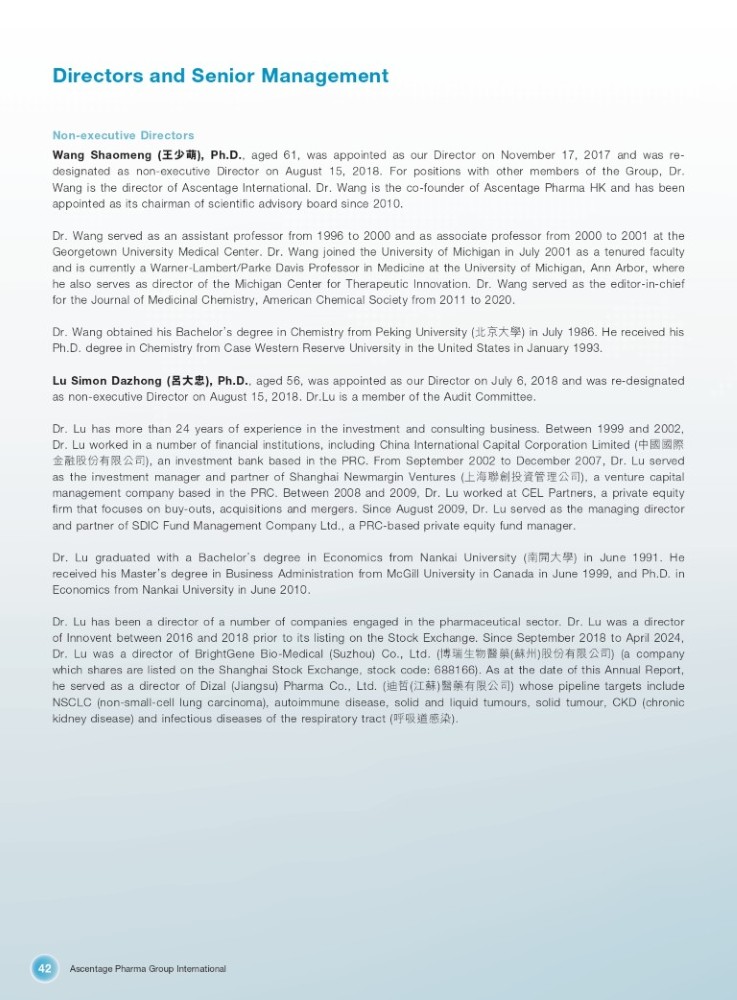 Ascentage Pharma Group International 42 Directors and Senior Management Non - executive Directors Wang Shaomeng ( ⦻ቁ㨼 ), Ph . D . , aged 61 , was appointed as our Director on November 17 , 2017 and was re - designated as non - executive Director on August 15 , 2018 . For positions with other members of the Group , Dr . Wang is the director of Ascentage International . Dr . Wang is the co - founder of Ascentage Pharma HK and has been appointed as its chairman of scientific advisory board since 2010 . Dr . Wang served as an assistant professor from 1996 to 2000 and as associate professor from 2000 to 2001 at the Georgetown University Medical Center . Dr . Wang joined the University of Michigan in July 2001 as a tenured faculty and is currently a Warner - Lambert/Parke Davis Professor in Medicine at the University of Michigan, Ann Arbor, where he also serves as director of the Michigan Center for Therapeutic Innovation . Dr . Wang served as the editor - in - chief for the Journal of Medicinal Chemistry, American Chemical Society from 2011 to 2020 . Dr . Wang obtained his Bachelor ’ s degree in Chemistry from Peking University ( ेӜབྷᆨ ) in July 1986 . He received his Ph . D . degree in Chemistry from Case Western Reserve University in the United States in January 1993 . Lu Simon Dazhong ( ੲབྷᘐ ), Ph . D . , aged 56 , was appointed as our Director on July 6 , 2018 and was re - designated as non - executive Director on August 15 , 2018 . Dr . Lu is a member of the Audit Committee . Dr . Lu has more than 24 years of experience in the investment and consulting business . Between 1999 and 2002 , Dr . Lu worked in a number of financial institutions , including China International Capital Corporation Limited ( ѝ഻഻䳋 䠁㶽㛑ԭᴹ䲀ޜਨ ), an investment bank based in the PRC . From September 2002 to December 2007 , Dr . Lu served as the investment manager and partner of Shanghai Newmargin Ventures ( к⎧㚟ࢥᣅ䋷㇑⨶ޜਨ ), a venture capital management company based in the PRC . Between 2008 and 2009 , Dr . Lu worked at CEL Partners , a private equity firm that focuses on buy - outs , acquisitions and mergers . Since August 2009 , Dr . Lu served as the managing director and partner of SDIC Fund Management Company Ltd . , a PRC - based private equity fund manager . Dr . Lu graduated with a Bachelor ’ s degree in Economics from Nankai University ( ই䮻བྷᆨ ) in June 1991 . He received his Master ’ s degree in Business Administration from McGill University in Canada in June 1999 , and Ph . D . in Economics from Nankai University in June 2010 . Dr . Lu has been a director of a number of companies engaged in the pharmaceutical sector . Dr . Lu was a director of Innovent between 2016 and 2018 prior to its listing on the Stock Exchange . Since September 2018 to April 2024 , Dr . Lu was a director of BrightGene Bio - Medical (Suzhou ) Co . , Ltd . ( ঊ⪎⭏⢙䟛㰕 ( 㰷ᐎ ) 㛑ԭᴹ䲀ޜਨ ) ( a company which shares are listed on the Shanghai Stock Exchange , stock code : 688166 ) . As at the date of this Annual Report, he served as a director of Dizal (Jiangsu ) Pharma Co . , Ltd . ( 䘚ଢ ( ⊏㰷 ) 䟛㰕ᴹ䲀ޜਨ ) whose pipeline targets include NSCLC (non - small - cell lung carcinoma) , autoimmune disease , solid and liquid tumours , solid tumour , CKD (chronic kidney disease ) and infectious diseases of the respiratory tract ( બ੨䚃ᝏḃ ) .