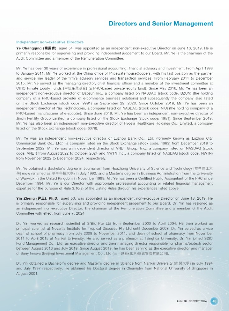 ANNUAL REPORT 2024 43 Directors and Senior Management Independent non - executive Directors Ye Changqing ( 㩹䮧䶂 ) , aged 54 , was appointed as an independent non - executive Director on June 13 , 2019 . He is primarily responsible for supervising and providing independent judgement to our Board . Mr . Ye is the chairman of the Audit Committee and a member of the Remuneration Committee . Mr . Ye has over 30 years of experience in professional accounting , financial advisory and investment . From April 1993 to January 2011 , Mr . Ye worked at the China office of PricewaterhouseCoopers , with his last position as the partner and service line leader of the firm ’ s advisory services and transaction services . From February 2011 to December 2015 , Mr . Ye served as the managing director , chief financial officer and a member of the investment committee at CITIC Private Equity Funds ( ѝؑ⭒ᾝส䠁 ) ( a PRC - based private equity fund) . Since May 2016 , Mr . Ye has been an independent non - executive director of Baozun Inc . , a company listed on NASDAQ (stock code : BZUN ) (the holding company of a PRC - based provider of e - commerce business solutions ) and subsequently the company also listed on the Stock Exchange (stock code : 9991 ) on September 29 , 2020 . Since October 2018 , Mr . Ye has been an independent director of Niu Technologies , a company listed on NASDAQ (stock code : NIU ) (the holding company of a PRC - based manufacturer of e - scooter) . Since June 2019 , Mr . Ye has been an independent non - executive director of Jinxin Fertility Group Limited , a company listed on the Stock Exchange (stock code : 1951 ) . Since September 2019 , Mr . Ye has also been an independent non - executive director of Hygeia Healthcare Holdings Co . , Limited , a company listed on the Stock Exchange (stock code : 6078 ) . Mr . Ye was an independent non - executive director of Luzhou Bank Co . , Ltd . (formerly known as Luzhou City Commercial Bank Co . , Ltd . ), a company listed on the Stock Exchange (stock code : 1983 ) from December 2018 to September 2022 . Mr . Ye was an independent director of VNET Group, Inc . , a company listed on NASDAQ (stock code : VNET) from August 2022 to October 2024 and NWTN Inc . , a company listed on NASDAQ (stock code : NWTN) from November 2022 to December 2024 , respectively . Mr . Ye obtained a Bachelor ’ s degree in Journalism from Huazhong University of Science and Technology ( 㨟ѝ⨶ᐕབྷ ᆨ ) (now renamed as 㨟ѝ、ᢰབྷᆨ ) in July 1992 , and a Master ’ s degree in Business Administration from the University of Warwick in the United Kingdom in November 1999 . Mr . Ye has been a Certified Public Accountant of the PRC since December 1994 . Mr . Ye is our Director with appropriate professional accounting or related financial management expertise for the purpose of Rule 3 . 10 ( 2 ) of the Listing Rules through his experiences listed above . Yin Zheng ( ቩ↓ ), Ph . D . , aged 53 , was appointed as an independent non - executive Director on June 13 , 2019 . He is primarily responsible for supervising and providing independent judgement to our Board . Dr . Yin has resigned as an independent non - executive Director , the chairman of the Remuneration Committee and a member of the Audit Committee with effect from June 7 , 2024 Dr . Yin worked as research scientist at S*Bio Pte Ltd from September 2000 to April 2004 . He then worked as principal scientist at Novartis Institute for Tropical Diseases Pte Ltd until December 2008 . Dr . Yin served as a vice dean of school of pharmacy from July 2009 to November 2011 , and dean of school of pharmacy from November 2011 to April 2015 at Nankai University . He also served as a professor at Tsinghua University . Dr . Yin joined SDIC Fund Management Co . , Ltd . as executive director and then managing director responsible for pharma/biotech sector between August 2016 and July 2018 . Since August 2018 , he has been serving as the executive director and manager of Sany Innova (Beijing ) Investment Management Co . , Ltd ( йаࢥᯠ ( ेӜ ) ᣅ䋷㇑⨶ᴹ䲀ޜਨ ) . Dr . Yin obtained a Bachelor ’ s degree and Master ’ s degree in Science from Nankai University ( ই䮻བྷᆨ ) in July 1994 and July 1997 respectively . He obtained his Doctoral degree in Chemistry from National University of Singapore in August 2001 .