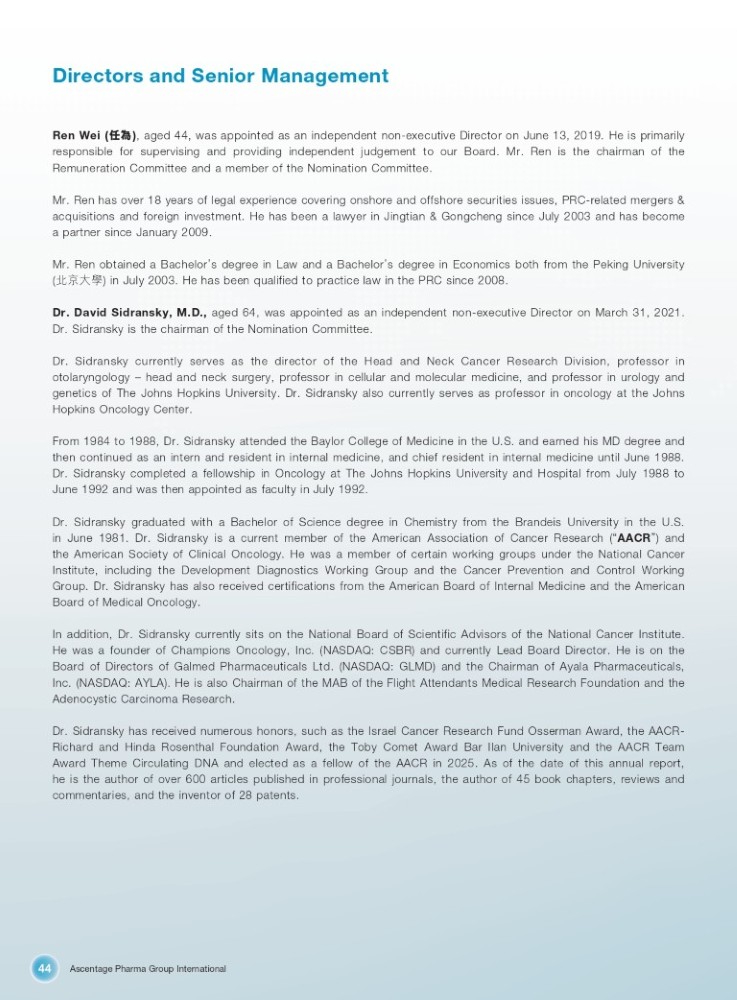 Ascentage Pharma Group International 44 Directors and Senior Management Ren Wei ( ԫ⛪ ) , aged 44 , was appointed as an independent non - executive Director on June 13 , 2019 . He is primarily responsible for supervising and providing independent judgement to our Board . Mr . Ren is the chairman of the Remuneration Committee and a member of the Nomination Committee . Mr . Ren has over 18 years of legal experience covering onshore and offshore securities issues, PRC - related mergers & acquisitions and foreign investment . He has been a lawyer in Jingtian & Gongcheng since July 2003 and has become a partner since January 2009 . Mr . Ren obtained a Bachelor ’ s degree in Law and a Bachelor ’ s degree in Economics both from the Peking University ( ेӜབྷᆨ ) in July 2003 . He has been qualified to practice law in the PRC since 2008 . Dr . David Sidransky, M . D . , aged 64 , was appointed as an independent non - executive Director on March 31 , 2021 . Dr . Sidransky is the chairman of the Nomination Committee . Dr . Sidransky currently serves as the director of the Head and Neck Cancer Research Division, professor in otolaryngology – head and neck surgery, professor in cellular and molecular medicine, and professor in urology and genetics of The Johns Hopkins University . Dr . Sidransky also currently serves as professor in oncology at the Johns Hopkins Oncology Center . From 1984 to 1988 , Dr . Sidransky attended the Baylor College of Medicine in the U . S . and earned his MD degree and then continued as an intern and resident in internal medicine, and chief resident in internal medicine until June 1988 . Dr . Sidransky completed a fellowship in Oncology at The Johns Hopkins University and Hospital from July 1988 to June 1992 and was then appointed as faculty in July 1992 . Dr . Sidransky graduated with a Bachelor of Science degree in Chemistry from the Brandeis University in the U . S . in June 1981 . Dr . Sidransky is a current member of the American Association of Cancer Research ( “ AACR ” ) and the American Society of Clinical Oncology . He was a member of certain working groups under the National Cancer Institute, including the Development Diagnostics Working Group and the Cancer Prevention and Control Working Group . Dr . Sidransky has also received certifications from the American Board of Internal Medicine and the American Board of Medical Oncology . In addition, Dr . Sidransky currently sits on the National Board of Scientific Advisors of the National Cancer Institute . He was a founder of Champions Oncology, Inc . (NASDAQ : CSBR) and currently Lead Board Director . He is on the Board of Directors of Galmed Pharmaceuticals Ltd . (NASDAQ : GLMD) and the Chairman of Ayala Pharmaceuticals, Inc . (NASDAQ : AYLA) . He is also Chairman of the MAB of the Flight Attendants Medical Research Foundation and the Adenocystic Carcinoma Research . Dr . Sidransky has received numerous honors, such as the Israel Cancer Research Fund Osserman Award, the AACR - Richard and Hinda Rosenthal Foundation Award, the Toby Comet Award Bar Ilan University and the AACR Team Award Theme Circulating DNA and elected as a fellow of the AACR in 2025 . As of the date of this annual report, he is the author of over 600 articles published in professional journals, the author of 45 book chapters, reviews and commentaries, and the inventor of 28 patents .