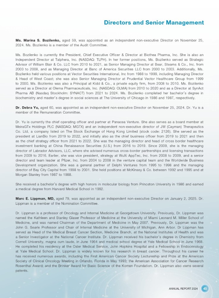 ANNUAL REPORT 2024 45 Directors and Senior Management Ms . Marina S . Bozilenko, aged 59 , was appointed as an independent non - executive Director on November 25 , 2024 . Ms . Bozilenko is a member of the Audit Committee . Ms . Bozilenko is currently the President, Chief Executive Officer & Director at Biothea Pharma, Inc . She is also an Independent Director at Talphera, Inc . (NASDAQ : TLPH) . In her former positions, Ms . Bozilenko served as Strategic Advisor of William Blair & Co . LLC from 2010 to 2021 , as Senior Managing Director at Bear, Stearns & Co . , Inc . from 2003 to 2008 , and as Managing Director at Banc of America Securities LLC from 2000 to 2003 . Additionally, Ms . Bozilenko held various positions at Vector Securities International, Inc from 1988 to 1999 , including Managing Director & Head of West Coast ; she was also Senior Managing Director at Prudential Vector Healthcare Group from 1999 to 2000 . Ms . Bozilenko was also a Principal at Kidd & Co . , a private equity firm, from 2008 to 2010 . Ms . Bozilenko served as a Director at Olema Pharmaceuticals, Inc . (NASDAQ : OLMA) from 2010 to 2020 and as a Director at SynAct Pharma AB (Nasdaq Stockholm : SYNACT) from 2021 to 2024 . Ms . Bozilenko completed her bachelor ’ s degree in biochemistry and master ’ s degree in social sciences at The University of Chicago in 1986 and 1987 , respectively . Dr . Debra Yu, aged 60 , was appointed as an independent non - executive Director on November 25 , 2024 . Dr . Yu is a member of the Remuneration Committee . Dr . Yu is currently the chief operating officer and partner at Panacea Venture . She also serves as a board member at MeiraGTx Holdings PLC (NASDAQ : MGTX) and an independent non - executive director of JW (Cayman) Therapeutics Co . Ltd, a company listed on The Stock Exchange of Hong Kong Limited (stock code : 2126 ) . She served as the president at LianBio from 2019 to 2022 , and initially also as the chief business officer from 2019 to 2021 and then as the chief strategy officer from 2021 to 2022 . She was the managing director and head of cross border healthcare investment banking at China Renaissance Securities (U . S . ) from 2016 to 2019 . Since 2009 , she is the managing director of Labrador Advisors, LLC, where she advised numerous cross - border partnerships and licensing transactions from 2009 to 2016 . Earlier, she was vice president, strategy at WuXi AppTec, Inc . from 2008 to 2009 , and a senior director and team leader at Pfizer, Inc . from 2004 to 2008 in the venture capital team and the Worldwide Business Development organization . She was a general partner of Delphi Ventures from 1995 to 1998 and the managing director of Bay City Capital from 1998 to 2001 . She held positions at McKinsey & Co . between 1992 and 1995 and at Morgan Stanley from 1987 to 1988 . She received a bachelor ’ s degree with high honors in molecular biology from Princeton University in 1986 and earned a medical degree from Harvard Medical School in 1992 . Marc E . Lippman, MD, aged 79 , was appointed as an independent non - executive Director on January 2 , 2025 . Dr . Lippman is a member of the Nomination Committee . Dr . Lippman is a professor of Oncology and Internal Medicine at Georgetown University . Previously, Dr . Lippman was named the Kathleen and Stanley Glaser Professor of Medicine at the University of Miami Leonard M . Miller School of Medicine, and was named Chairman of the Department of Medicine in May 2007 . Previously, Dr . Lippman was the John G . Searle Professor and Chair of Internal Medicine at the University of Michigan, Ann Arbor . Dr Lippman has served as Head of the Medical Breast Cancer Section, Medicine Branch, at the National Institutes of Health and was a Senior Investigator at the National Cancer Institute . Dr . Lippman received his bachelor ’ s degree in Chemistry from Cornell University, magna cum laude, in June 1964 and medical school degree at Yale Medical School in June 1968 . He completed his residency at the Osler Medical Service, John Hopkins Hospital and a Fellowship in Endocrinology at Yale Medical School . Dr . Lippman is widely known for his research in breast cancer . Throughout his career he has received numerous awards, including the First American Cancer Society Lectureship and Prize at the American Society of Clinical Oncology Meeting in Orlando, Florida in May 1993 ; the American Association for Cancer Research Rosenthal Award ; and the Brinker Award for Basic Science of the Komen Foundation . Dr . Lippman also owns several patents .