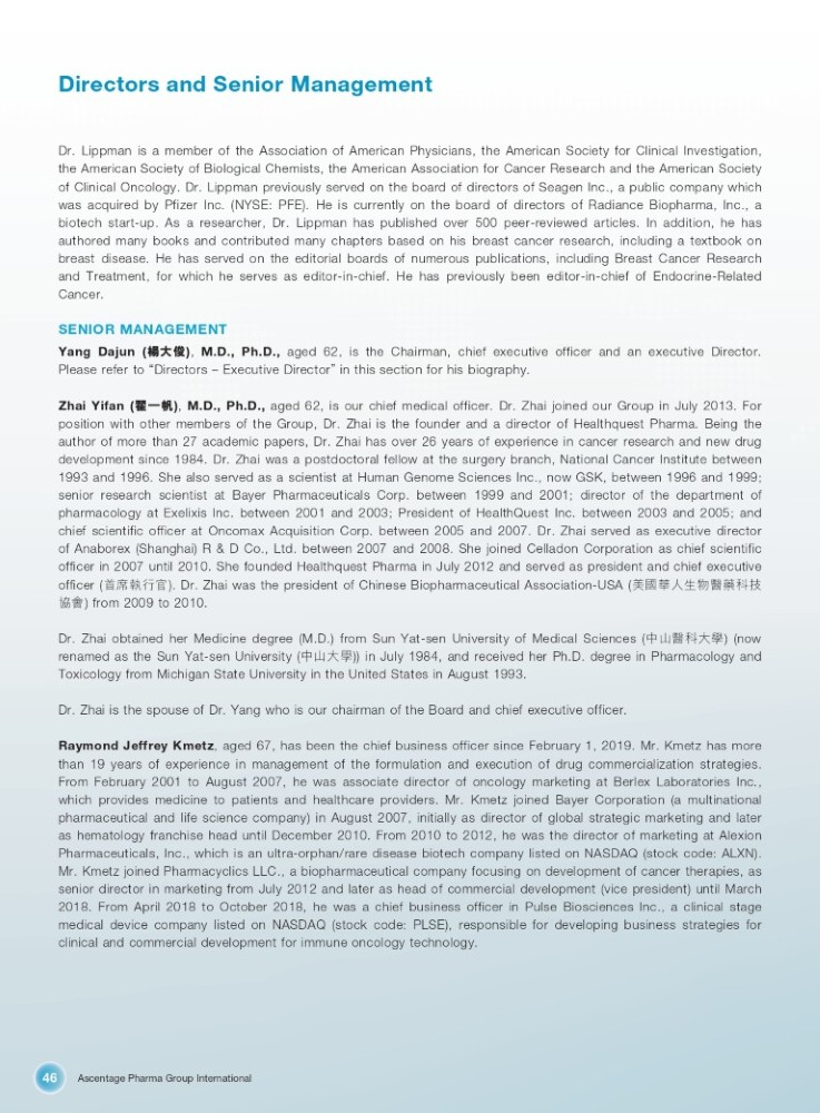 Ascentage Pharma Group International 46 Directors and Senior Management Dr . Lippman is a member of the Association of American Physicians, the American Society for Clinical Investigation, the American Society of Biological Chemists, the American Association for Cancer Research and the American Society of Clinical Oncology . Dr . Lippman previously served on the board of directors of Seagen Inc . , a public company which was acquired by Pfizer Inc . (NYSE : PFE) . He is currently on the board of directors of Radiance Biopharma, Inc . , a biotech start - up . As a researcher, Dr . Lippman has published over 500 peer - reviewed articles . In addition, he has authored many books and contributed many chapters based on his breast cancer research, including a textbook on breast disease . He has served on the editorial boards of numerous publications, including Breast Cancer Research and Treatment, for which he serves as editor - in - chief . He has previously been editor - in - chief of Endocrine - Related Cancer . SENIOR MANAGEMENT Yang Dajun ( ὺབྷ׺ ) , M . D . , Ph . D . , aged 62 , is the Chairman , chief executive officer and an executive Director . Please refer to “ Directors – Executive Director ” in this section for his biography . Zhai Yifan ( 㘏аᐶ ) , M . D . , Ph . D . , aged 62 , is our chief medical officer . Dr . Zhai joined our Group in July 2013 . For position with other members of the Group , Dr . Zhai is the founder and a director of Healthquest Pharma . Being the author of more than 27 academic papers , Dr . Zhai has over 26 years of experience in cancer research and new drug development since 1984 . Dr . Zhai was a postdoctoral fellow at the surgery branch , National Cancer Institute between 1993 and 1996 . She also served as a scientist at Human Genome Sciences Inc . , now GSK , between 1996 and 1999 ; senior research scientist at Bayer Pharmaceuticals Corp . between 1999 and 2001 ; director of the department of pharmacology at Exelixis Inc . between 2001 and 2003 ; President of HealthQuest Inc . between 2003 and 2005 ; and chief scientific officer at Oncomax Acquisition Corp . between 2005 and 2007 . Dr . Zhai served as executive director of Anaborex (Shanghai ) R & D Co . , Ltd . between 2007 and 2008 . She joined Celladon Corporation as chief scientific officer in 2007 until 2010 . She founded Healthquest Pharma in July 2012 and served as president and chief executive officer ( 俆ᑝว㹼ᇈ ) . Dr . Zhai was the president of Chinese Biopharmaceutical Association - USA ( 㖾഻㨟Ӫ⭏⢙䟛㰕、ᢰ ঄ᴳ ) from 2009 to 2010 . Dr . Zhai obtained her Medicine degree (M . D . ) from Sun Yat - sen University of Medical Sciences ( ѝኡ䟛、བྷᆨ ) (now renamed as the Sun Yat - sen University ( ѝኡབྷᆨ )) in July 1984 , and received her Ph . D . degree in Pharmacology and Toxicology from Michigan State University in the United States in August 1993 . Dr . Zhai is the spouse of Dr . Yang who is our chairman of the Board and chief executive officer . Raymond Jeffrey Kmetz , aged 67 , has been the chief business officer since February 1 , 2019 . Mr . Kmetz has more than 19 years of experience in management of the formulation and execution of drug commercialization strategies . From February 2001 to August 2007 , he was associate director of oncology marketing at Berlex Laboratories Inc . , which provides medicine to patients and healthcare providers . Mr . Kmetz joined Bayer Corporation (a multinational pharmaceutical and life science company) in August 2007 , initially as director of global strategic marketing and later as hematology franchise head until December 2010 . From 2010 to 2012 , he was the director of marketing at Alexion Pharmaceuticals, Inc . , which is an ultra - orphan/rare disease biotech company listed on NASDAQ (stock code : ALXN) . Mr . Kmetz joined Pharmacyclics LLC . , a biopharmaceutical company focusing on development of cancer therapies, as senior director in marketing from July 2012 and later as head of commercial development (vice president) until March 2018 . From April 2018 to October 2018 , he was a chief business officer in Pulse Biosciences Inc . , a clinical stage medical device company listed on NASDAQ (stock code : PLSE), responsible for developing business strategies for clinical and commercial development for immune oncology technology .