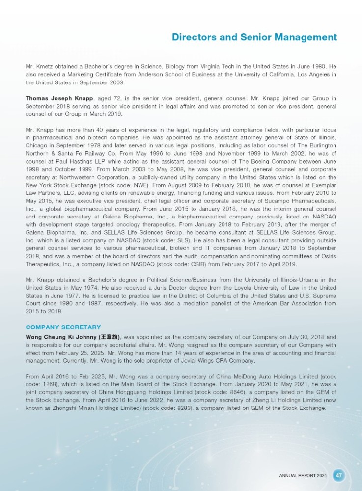 ANNUAL REPORT 2024 47 Directors and Senior Management Mr . Kmetz obtained a Bachelor ’ s degree in Science, Biology from Virginia Tech in the United States in June 1980 . He also received a Marketing Certificate from Anderson School of Business at the University of California, Los Angeles in the United States in September 2003 . Thomas Joseph Knapp , aged 72 , is the senior vice president, general counsel . Mr . Knapp joined our Group in September 2018 serving as senior vice president in legal affairs and was promoted to senior vice president, general counsel of our Group in March 2019 . Mr . Knapp has more than 40 years of experience in the legal, regulatory and compliance fields, with particular focus in pharmaceutical and biotech companies . He was appointed as the assistant attorney general of State of Illinois, Chicago in September 1978 and later served in various legal positions, including as labor counsel of The Burlington Northern & Santa Fe Railway Co . From May 1996 to June 1998 and November 1999 to March 2002 , he was of counsel at Paul Hastings LLP while acting as the assistant general counsel of The Boeing Company between June 1998 and October 1999 . From March 2003 to May 2008 , he was vice president, general counsel and corporate secretary at Northwestern Corporation, a publicly - owned utility company in the United States which is listed on the New York Stock Exchange (stock code : NWE) . From August 2009 to February 2010 , he was of counsel at Exemplar Law Partners, LLC, advising clients on renewable energy, financing funding and various issues . From February 2010 to May 2015 , he was executive vice president, chief legal officer and corporate secretary of Sucampo Pharmaceuticals, Inc . , a global biopharmaceutical company . From June 2015 to January 2018 , he was the interim general counsel and corporate secretary at Galena Biopharma, Inc . , a biopharmaceutical company previously listed on NASDAQ with development stage targeted oncology therapeutics . From January 2018 to February 2019 , after the merger of Galena Biopharma, Inc . and SELLAS Life Sciences Group, he became consultant at SELLAS Life Sciences Group, Inc . which is a listed company on NASDAQ (stock code : SLS) . He also has been a legal consultant providing outside general counsel services to various pharmaceutical, biotech and IT companies from January 2018 to September 2018 , and was a member of the board of directors and the audit, compensation and nominating committees of Osiris Therapeutics, Inc . , a company listed on NASDAQ (stock code : OSIR) from February 2017 to April 2019 . Mr . Knapp obtained a Bachelor ’ s degree in Political Science/Business from the University of Illinois - Urbana in the United States in May 1974 . He also received a Juris Doctor degree from the Loyola University of Law in the United States in June 1977 . He is licensed to practice law in the District of Columbia of the United States and U . S . Supreme Court since 1980 and 1987 , respectively . He was also a mediation panelist of the American Bar Association from 2015 to 2018 . COMPANY SECRETARY Wong Cheung Ki Johnny ( ⦻ㄐᰇ ) , was appointed as the company secretary of our Company on July 30 , 2018 and is responsible for our company secretarial affairs . Mr . Wong resigned as the company secretary of our Company with effect from February 25 , 2025 . Mr . Wong has more than 14 years of experience in the area of accounting and financial management . Currently , Mr . Wong is the sole proprietor of Jovial Wings CPA Company . From April 2016 to Feb 2025 , Mr . Wong was a company secretary of China MeiDong Auto Holdings Limited (stock code : 1268 ), which is listed on the Main Board of the Stock Exchange . From January 2020 to May 2021 , he was a joint company secretary of China Hongguang Holdings Limited (stock code : 8646 ), a company listed on the GEM of the Stock Exchange . From April 2016 to June 2022 , he was a company secretary of Zheng Li Holdings Limited (now known as Zhongshi Minan Holdings Limited) (stock code : 8283 ), a company listed on GEM of the Stock Exchange .