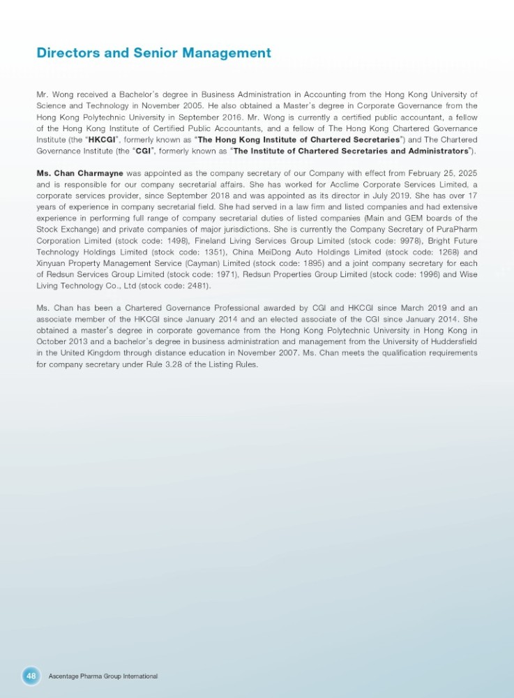 Ascentage Pharma Group International 48 Directors and Senior Management Mr . Wong received a Bachelor ’ s degree in Business Administration in Accounting from the Hong Kong University of Science and Technology in November 2005 . He also obtained a Master ’ s degree in Corporate Governance from the Hong Kong Polytechnic University in September 2016 . Mr . Wong is currently a certified public accountant, a fellow of the Hong Kong Institute of Certified Public Accountants, and a fellow of The Hong Kong Chartered Governance Institute (the “ HKCGI ” , formerly known as “ The Hong Kong Institute of Chartered Secretaries ” ) and The Chartered Governance Institute (the “ CGI ” , formerly known as “ The Institute of Chartered Secretaries and Administrators ” ) . Ms . Chan Charmayne was appointed as the company secretary of our Company with effect from February 25 , 2025 and is responsible for our company secretarial affairs . She has worked for Acclime Corporate Services Limited, a corporate services provider, since September 2018 and was appointed as its director in July 2019 . She has over 17 years of experience in company secretarial field . She had served in a law firm and listed companies and had extensive experience in performing full range of company secretarial duties of listed companies (Main and GEM boards of the Stock Exchange) and private companies of major jurisdictions . She is currently the Company Secretary of PuraPharm Corporation Limited (stock code : 1498 ), Fineland Living Services Group Limited (stock code : 9978 ), Bright Future Technology Holdings Limited (stock code : 1351 ), China MeiDong Auto Holdings Limited (stock code : 1268 ) and Xinyuan Property Management Service (Cayman) Limited (stock code : 1895 ) and a joint company secretary for each of Redsun Services Group Limited (stock code : 1971 ), Redsun Properties Group Limited (stock code : 1996 ) and Wise Living Technology Co . , Ltd (stock code : 2481 ) . Ms . Chan has been a Chartered Governance Professional awarded by CGI and HKCGI since March 2019 and an associate member of the HKCGI since January 2014 and an elected associate of the CGI since January 2014 . She obtained a master ’ s degree in corporate governance from the Hong Kong Polytechnic University in Hong Kong in October 2013 and a bachelor ’ s degree in business administration and management from the University of Huddersfield in the United Kingdom through distance education in November 2007 . Ms . Chan meets the qualification requirements for company secretary under Rule 3 . 28 of the Listing Rules .
