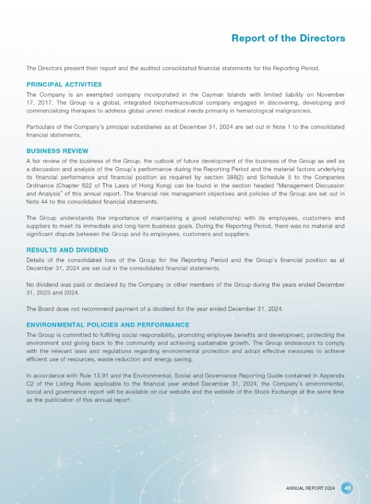 ANNUAL REPORT 2024 49 Report of the Directors The Directors present their report and the audited consolidated financial statements for the Reporting Period . PRINCIPAL ACTIVITIES The Company is an exempted company incorporated in the Cayman Islands with limited liability on November 17 , 2017 . The Group is a global, integrated biopharmaceutical company engaged in discovering, developing and commercializing therapies to address global unmet medical needs primarily in hematological malignancies . Particulars of the Company ’ s principal subsidiaries as at December 31 , 2024 are set out in Note 1 to the consolidated financial statements . BUSINESS REVIEW A fair review of the business of the Group, the outlook of future development of the business of the Group as well as a discussion and analysis of the Group ’ s performance during the Reporting Period and the material factors underlying its financial performance and financial position as required by section 388 ( 2 ) and Schedule 5 to the Companies Ordinance (Chapter 622 of The Laws of Hong Kong) can be found in the section headed “ Management Discussion and Analysis ” of this annual report . The financial risk management objectives and policies of the Group are set out in Note 44 to the consolidated financial statements . The Group understands the importance of maintaining a good relationship with its employees, customers and suppliers to meet its immediate and long - term business goals . During the Reporting Period, there was no material and significant dispute between the Group and its employees, customers and suppliers . RESULTS AND DIVIDEND Details of the consolidated loss of the Group for the Reporting Period and the Group ’ s financial position as at December 31 , 2024 are set out in the consolidated financial statements . No dividend was paid or declared by the Company or other members of the Group during the years ended December 31 , 2023 and 2024 . The Board does not recommend payment of a dividend for the year ended December 31 , 2024 . ENVIRONMENTAL POLICIES AND PERFORMANCE The Group is committed to fulfilling social responsibility, promoting employee benefits and development, protecting the environment and giving back to the community and achieving sustainable growth . The Group endeavours to comply with the relevant laws and regulations regarding environmental protection and adopt effective measures to achieve efficient use of resources, waste reduction and energy saving . In accordance with Rule 13 . 91 and the Environmental, Social and Governance Reporting Guide contained in Appendix C 2 of the Listing Rules applicable to the financial year ended December 31 , 2024 , the Company ’ s environmental, social and governance report will be available on our website and the website of the Stock Exchange at the same time as the publication of this annual report .