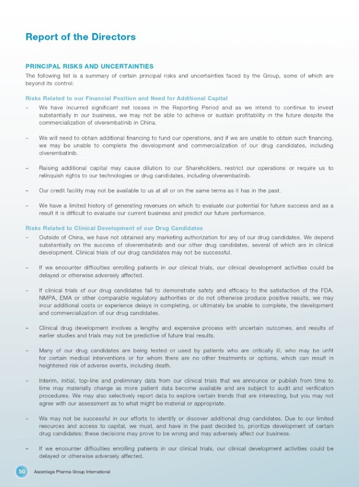 Ascentage Pharma Group International 50 Report of the Directors PRINCIPAL RISKS AND UNCERTAINTIES The following list is a summary of certain principal risks and uncertainties faced by the Group, some of which are beyond its control: Risks Related to our Financial Position and Need for Additional Capital – We have incurred significant net losses in the Reporting Period and as we intend to continue to invest substantially in our business, we may not be able to achieve or sustain profitability in the future despite the commercialization of olverembatinib in China . – We will need to obtain additional financing to fund our operations, and if we are unable to obtain such financing, we may be unable to complete the development and commercialization of our drug candidates, including olverembatinib . – Raising additional capital may cause dilution to our Shareholders, restrict our operations or require us to relinquish rights to our technologies or drug candidates, including olverembatinib . – Our credit facility may not be available to us at all or on the same terms as it has in the past. – We have a limited history of generating revenues on which to evaluate our potential for future success and as a result it is difficult to evaluate our current business and predict our future performance . Risks Related to Clinical Development of our Drug Candidates – Outside of China, we have not obtained any marketing authorization for any of our drug candidates . We depend substantially on the success of olverembatinib and our other drug candidates, several of which are in clinical development . Clinical trials of our drug candidates may not be successful . – If we encounter difficulties enrolling patients in our clinical trials, our clinical development activities could be delayed or otherwise adversely affected . – If clinical trials of our drug candidates fail to demonstrate safety and efficacy to the satisfaction of the FDA, NMPA, EMA or other comparable regulatory authorities or do not otherwise produce positive results, we may incur additional costs or experience delays in completing, or ultimately be unable to complete, the development and commercialization of our drug candidates . – Clinical drug development involves a lengthy and expensive process with uncertain outcomes, and results of earlier studies and trials may not be predictive of future trial results . – Many of our drug candidates are being tested or used by patients who are critically ill, who may be unfit for certain medical interventions or for whom there are no other treatments or options, which can result in heightened risk of adverse events, including death . – Interim, initial, top - line and preliminary data from our clinical trials that we announce or publish from time to time may materially change as more patient data become available and are subject to audit and verification procedures . We may also selectively report data to explore certain trends that are interesting, but you may not agree with our assessment as to what might be material or appropriate . – We may not be successful in our efforts to identify or discover additional drug candidates . Due to our limited resources and access to capital, we must, and have in the past decided to, prioritize development of certain drug candidates ; these decisions may prove to be wrong and may adversely affect our business . – If we encounter difficulties enrolling patients in our clinical trials, our clinical development activities could be delayed or otherwise adversely affected .