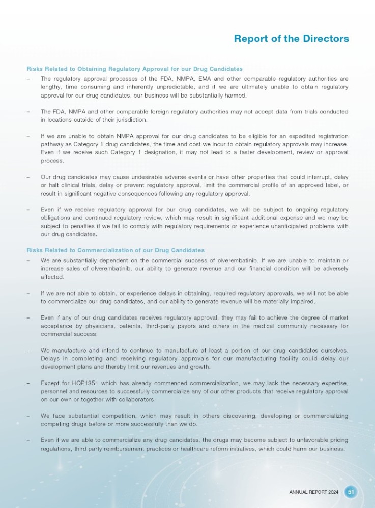 ANNUAL REPORT 2024 51 Report of the Directors Risks Related to Obtaining Regulatory Approval for our Drug Candidates – The regulatory approval processes of the FDA, NMPA, EMA and other comparable regulatory authorities are lengthy, time consuming and inherently unpredictable, and if we are ultimately unable to obtain regulatory approval for our drug candidates, our business will be substantially harmed . – The FDA, NMPA and other comparable foreign regulatory authorities may not accept data from trials conducted in locations outside of their jurisdiction . – If we are unable to obtain NMPA approval for our drug candidates to be eligible for an expedited registration pathway as Category 1 drug candidates, the time and cost we incur to obtain regulatory approvals may increase . Even if we receive such Category 1 designation, it may not lead to a faster development, review or approval process . – Our drug candidates may cause undesirable adverse events or have other properties that could interrupt, delay or halt clinical trials, delay or prevent regulatory approval, limit the commercial profile of an approved label, or result in significant negative consequences following any regulatory approval . – Even if we receive regulatory approval for our drug candidates, we will be subject to ongoing regulatory obligations and continued regulatory review, which may result in significant additional expense and we may be subject to penalties if we fail to comply with regulatory requirements or experience unanticipated problems with our drug candidates . Risks Related to Commercialization of our Drug Candidates – We are substantially dependent on the commercial success of olverembatinib . If we are unable to maintain or increase sales of olverembatinib, our ability to generate revenue and our financial condition will be adversely affected . – If we are not able to obtain, or experience delays in obtaining, required regulatory approvals, we will not be able to commercialize our drug candidates, and our ability to generate revenue will be materially impaired . – Even if any of our drug candidates receives regulatory approval, they may fail to achieve the degree of market acceptance by physicians, patients, third - party payors and others in the medical community necessary for commercial success . – We manufacture and intend to continue to manufacture at least a portion of our drug candidates ourselves . Delays in completing and receiving regulatory approvals for our manufacturing facility could delay our development plans and thereby limit our revenues and growth . – Except for HQP 1351 which has already commenced commercialization, we may lack the necessary expertise, personnel and resources to successfully commercialize any of our other products that receive regulatory approval on our own or together with collaborators . – We face substantial competition, which may result in others discovering, developing or commercializing competing drugs before or more successfully than we do . – Even if we are able to commercialize any drug candidates, the drugs may become subject to unfavorable pricing regulations, third party reimbursement practices or healthcare reform initiatives, which could harm our business .