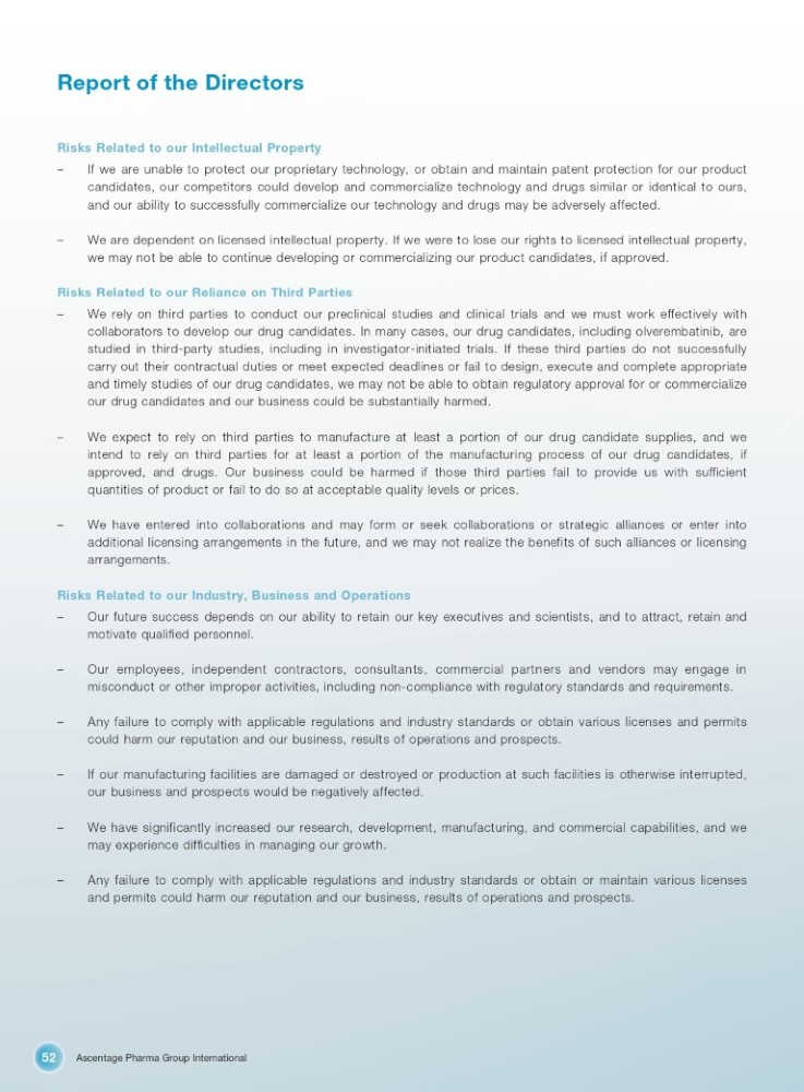Ascentage Pharma Group International 52 Report of the Directors Risks Related to our Intellectual Property – If we are unable to protect our proprietary technology, or obtain and maintain patent protection for our product candidates, our competitors could develop and commercialize technology and drugs similar or identical to ours, and our ability to successfully commercialize our technology and drugs may be adversely affected . – We are dependent on licensed intellectual property . If we were to lose our rights to licensed intellectual property, we may not be able to continue developing or commercializing our product candidates, if approved . Risks Related to our Reliance on Third Parties – We rely on third parties to conduct our preclinical studies and clinical trials and we must work effectively with collaborators to develop our drug candidates . In many cases, our drug candidates, including olverembatinib, are studied in third - party studies, including in investigator - initiated trials . If these third parties do not successfully carry out their contractual duties or meet expected deadlines or fail to design, execute and complete appropriate and timely studies of our drug candidates, we may not be able to obtain regulatory approval for or commercialize our drug candidates and our business could be substantially harmed . – We expect to rely on third parties to manufacture at least a portion of our drug candidate supplies, and we intend to rely on third parties for at least a portion of the manufacturing process of our drug candidates, if approved, and drugs . Our business could be harmed if those third parties fail to provide us with sufficient quantities of product or fail to do so at acceptable quality levels or prices . – We have entered into collaborations and may form or seek collaborations or strategic alliances or enter into additional licensing arrangements in the future, and we may not realize the benefits of such alliances or licensing arrangements . Risks Related to our Industry, Business and Operations – Our future success depends on our ability to retain our key executives and scientists, and to attract, retain and motivate qualified personnel . – Our employees, independent contractors, consultants, commercial partners and vendors may engage in misconduct or other improper activities, including non - compliance with regulatory standards and requirements . – Any failure to comply with applicable regulations and industry standards or obtain various licenses and permits could harm our reputation and our business, results of operations and prospects . – If our manufacturing facilities are damaged or destroyed or production at such facilities is otherwise interrupted, our business and prospects would be negatively affected . – We have significantly increased our research, development, manufacturing, and commercial capabilities, and we may experience difficulties in managing our growth . – Any failure to comply with applicable regulations and industry standards or obtain or maintain various licenses and permits could harm our reputation and our business, results of operations and prospects .