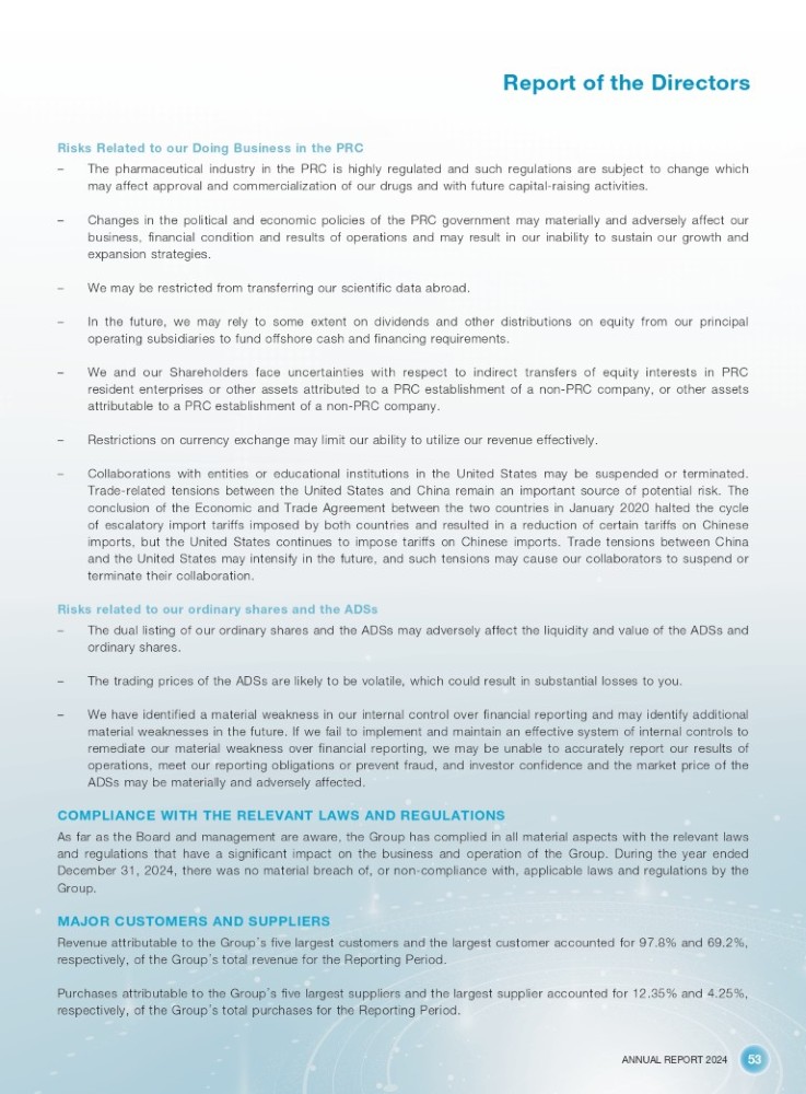 ANNUAL REPORT 2024 53 Report of the Directors Risks Related to our Doing Business in the PRC – The pharmaceutical industry in the PRC is highly regulated and such regulations are subject to change which may affect approval and commercialization of our drugs and with future capital - raising activities . – Changes in the political and economic policies of the PRC government may materially and adversely affect our business, financial condition and results of operations and may result in our inability to sustain our growth and expansion strategies . – We may be restricted from transferring our scientific data abroad. – In the future, we may rely to some extent on dividends and other distributions on equity from our principal operating subsidiaries to fund offshore cash and financing requirements . – We and our Shareholders face uncertainties with respect to indirect transfers of equity interests in PRC resident enterprises or other assets attributed to a PRC establishment of a non - PRC company, or other assets attributable to a PRC establishment of a non - PRC company . – Restrictions on currency exchange may limit our ability to utilize our revenue effectively. – Collaborations with entities or educational institutions in the United States may be suspended or terminated . Trade - related tensions between the United States and China remain an important source of potential risk . The conclusion of the Economic and Trade Agreement between the two countries in January 2020 halted the cycle of escalatory import tariffs imposed by both countries and resulted in a reduction of certain tariffs on Chinese imports, but the United States continues to impose tariffs on Chinese imports . Trade tensions between China and the United States may intensify in the future, and such tensions may cause our collaborators to suspend or terminate their collaboration . Risks related to our ordinary shares and the ADSs – The dual listing of our ordinary shares and the ADSs may adversely affect the liquidity and value of the ADSs and ordinary shares . – The trading prices of the ADSs are likely to be volatile, which could result in substantial losses to you. – We have identified a material weakness in our internal control over financial reporting and may identify additional material weaknesses in the future . If we fail to implement and maintain an effective system of internal controls to remediate our material weakness over financial reporting, we may be unable to accurately report our results of operations, meet our reporting obligations or prevent fraud, and investor confidence and the market price of the ADSs may be materially and adversely affected . COMPLIANCE WITH THE RELEVANT LAWS AND REGULATIONS As far as the Board and management are aware, the Group has complied in all material aspects with the relevant laws and regulations that have a significant impact on the business and operation of the Group . During the year ended December 31 , 2024 , there was no material breach of, or non - compliance with, applicable laws and regulations by the Group . MAJOR CUSTOMERS AND SUPPLIERS Revenue attributable to the Group ’ s five largest customers and the largest customer accounted for 97 . 8 % and 69 . 2 % , respectively, of the Group ’ s total revenue for the Reporting Period . Purchases attributable to the Group ’ s five largest suppliers and the largest supplier accounted for 12 . 35 % and 4 . 25 % , respectively, of the Group ’ s total purchases for the Reporting Period .