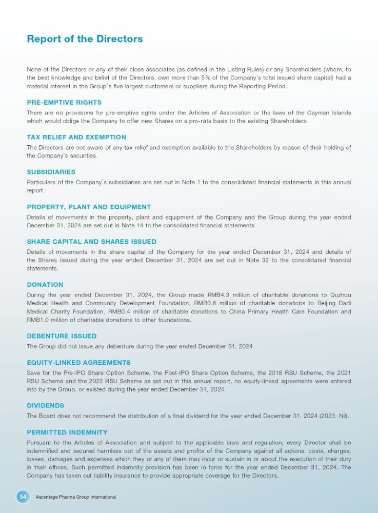 Ascentage Pharma Group International 54 Report of the Directors None of the Directors or any of their close associates (as defined in the Listing Rules) or any Shareholders (whom, to the best knowledge and belief of the Directors, own more than 5 % of the Company ’ s total issued share capital) had a material interest in the Group ’ s five largest customers or suppliers during the Reporting Period . PRE - EMPTIVE RIGHTS There are no provisions for pre - emptive rights under the Articles of Association or the laws of the Cayman Islands which would oblige the Company to offer new Shares on a pro - rata basis to the existing Shareholders . TAX RELIEF AND EXEMPTION The Directors are not aware of any tax relief and exemption available to the Shareholders by reason of their holding of the Company ’ s securities . SUBSIDIARIES Particulars of the Company ’ s subsidiaries are set out in Note 1 to the consolidated financial statements in this annual report . PROPERTY, PLANT AND EQUIPMENT Details of movements in the property, plant and equipment of the Company and the Group during the year ended December 31 , 2024 are set out in Note 14 to the consolidated financial statements . SHARE CAPITAL AND SHARES ISSUED Details of movements in the share capital of the Company for the year ended December 31 , 2024 and details of the Shares issued during the year ended December 31 , 2024 are set out in Note 32 to the consolidated financial statements . DONATION During the year ended December 31 , 2024 , the Group made RMB 4 . 3 million of charitable donations to Quzhou Medical Health and Community Development Foundation, RMB 0 . 6 million of charitable donations to Beijing Dadi Medical Charity Foundation, RMB 0 . 4 million of charitable donations to China Primary Health Care Foundation and RMB 1 . 0 million of charitable donations to other foundations . DEBENTURE ISSUED The Group did not issue any debenture during the year ended December 31 , 2024 . EQUITY - LINKED AGREEMENTS Save for the Pre - IPO Share Option Scheme, the Post - IPO Share Option Scheme, the 2018 RSU Scheme, the 2021 RSU Scheme and the 2022 RSU Scheme as set out in this annual report, no equity - linked agreements were entered into by the Group, or existed during the year ended December 31 , 2024 . DIVIDENDS The Board does not recommend the distribution of a final dividend for the year ended December 31 , 2024 ( 2023 : Nil) . PERMITTED INDEMNITY Pursuant to the Articles of Association and subject to the applicable laws and regulation, every Director shall be indemnified and secured harmless out of the assets and profits of the Company against all actions, costs, charges, losses, damages and expenses which they or any of them may incur or sustain in or about the execution of their duty in their offices . Such permitted indemnity provision has been in force for the year ended December 31 , 2024 . The Company has taken out liability insurance to provide appropriate coverage for the Directors .