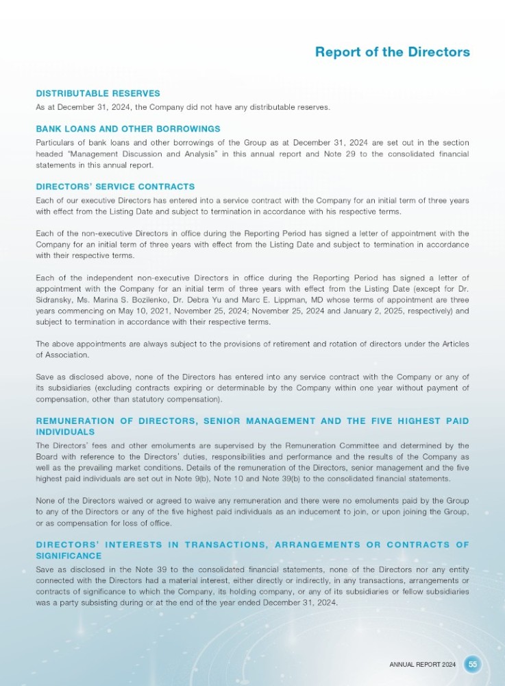 ANNUAL REPORT 2024 55 Report of the Directors DISTRIBUTABLE RESERVES As at December 31 , 2024 , the Company did not have any distributable reserves . BANK LOANS AND OTHER BORROWINGS Particulars of bank loans and other borrowings of the Group as at December 31 , 2024 are set out in the section headed “ Management Discussion and Analysis ” in this annual report and Note 29 to the consolidated financial statements in this annual report . DIRECTORS ’ SERVICE CONTRACTS Each of our executive Directors has entered into a service contract with the Company for an initial term of three years with effect from the Listing Date and subject to termination in accordance with his respective terms . Each of the non - executive Directors in office during the Reporting Period has signed a letter of appointment with the Company for an initial term of three years with effect from the Listing Date and subject to termination in accordance with their respective terms . Each of the independent non - executive Directors in office during the Reporting Period has signed a letter of appointment with the Company for an initial term of three years with effect from the Listing Date (except for Dr . Sidransky, Ms . Marina S . Bozilenko, Dr . Debra Yu and Marc E . Lippman, MD whose terms of appointment are three years commencing on May 10 , 2021 , November 25 , 2024 ; November 25 , 2024 and January 2 , 2025 , respectively) and subject to termination in accordance with their respective terms . The above appointments are always subject to the provisions of retirement and rotation of directors under the Articles of Association . Save as disclosed above, none of the Directors has entered into any service contract with the Company or any of its subsidiaries (excluding contracts expiring or determinable by the Company within one year without payment of compensation, other than statutory compensation) . REMUNERATION OF DIRECTORS, SENIOR MANAGEMENT AND THE FIVE HIGHEST PAID INDIVIDUALS The Directors ’ fees and other emoluments are supervised by the Remuneration Committee and determined by the Board with reference to the Directors ’ duties, responsibilities and performance and the results of the Company as well as the prevailing market conditions . Details of the remuneration of the Directors, senior management and the five highest paid individuals are set out in Note 9 (b), Note 10 and Note 39 (b) to the consolidated financial statements . None of the Directors waived or agreed to waive any remuneration and there were no emoluments paid by the Group to any of the Directors or any of the five highest paid individuals as an inducement to join, or upon joining the Group, or as compensation for loss of office . D IR E C T O R S ’ IN T E R E S T S IN T R A N S A C T IO N S , A R R A N G E ME N T S O R C O N T R A C T S O F SIGNIFICANCE Save as disclosed in the Note 39 to the consolidated financial statements, none of the Directors nor any entity connected with the Directors had a material interest, either directly or indirectly, in any transactions, arrangements or contracts of significance to which the Company, its holding company, or any of its subsidiaries or fellow subsidiaries was a party subsisting during or at the end of the year ended December 31 , 2024 .