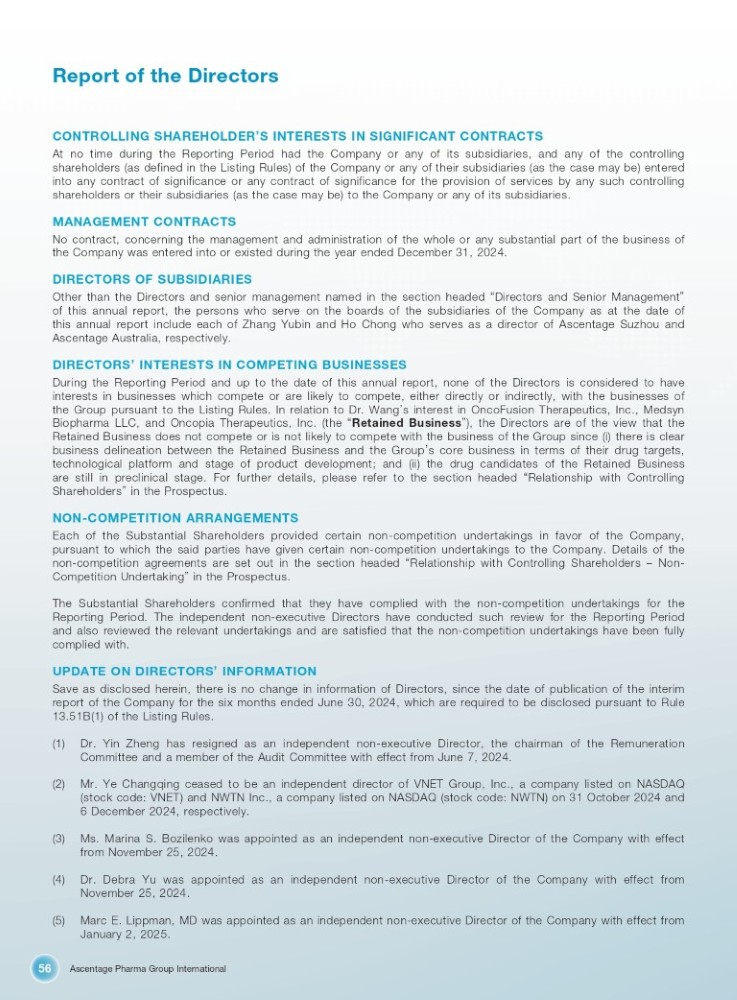 Ascentage Pharma Group International 56 Report of the Directors CONTROLLING SHAREHOLDER ’ S INTERESTS IN SIGNIFICANT CONTRACTS At no time during the Reporting Period had the Company or any of its subsidiaries, and any of the controlling shareholders (as defined in the Listing Rules) of the Company or any of their subsidiaries (as the case may be) entered into any contract of significance or any contract of significance for the provision of services by any such controlling shareholders or their subsidiaries (as the case may be) to the Company or any of its subsidiaries . MANAGEMENT CONTRACTS No contract, concerning the management and administration of the whole or any substantial part of the business of the Company was entered into or existed during the year ended December 31 , 2024 . DIRECTORS OF SUBSIDIARIES Other than the Directors and senior management named in the section headed “ Directors and Senior Management ” of this annual report, the persons who serve on the boards of the subsidiaries of the Company as at the date of this annual report include each of Zhang Yubin and Ho Chong who serves as a director of Ascentage Suzhou and Ascentage Australia, respectively . DIRECTORS ’ INTERESTS IN COMPETING BUSINESSES During the Reporting Period and up to the date of this annual report, none of the Directors is considered to have interests in businesses which compete or are likely to compete, either directly or indirectly, with the businesses of the Group pursuant to the Listing Rules . In relation to Dr . Wang ’ s interest in OncoFusion Therapeutics, Inc . , Medsyn Biopharma LLC, and Oncopia Therapeutics, Inc . (the “ Retained Business ” ), the Directors are of the view that the Retained Business does not compete or is not likely to compete with the business of the Group since (i) there is clear business delineation between the Retained Business and the Group ’ s core business in terms of their drug targets, technological platform and stage of product development ; and (ii) the drug candidates of the Retained Business are still in preclinical stage . For further details, please refer to the section headed “ Relationship with Controlling Shareholders ” in the Prospectus . NON - COMPETITION ARRANGEMENTS Each of the Substantial Shareholders provided certain non - competition undertakings in favor of the Company, pursuant to which the said parties have given certain non - competition undertakings to the Company . Details of the non - competition agreements are set out in the section headed “ Relationship with Controlling Shareholders – Non - Competition Undertaking ” in the Prospectus . The Substantial Shareholders confirmed that they have complied with the non - competition undertakings for the Reporting Period . The independent non - executive Directors have conducted such review for the Reporting Period and also reviewed the relevant undertakings and are satisfied that the non - competition undertakings have been fully complied with . UPDATE ON DIRECTORS ’ INFORMATION Save as disclosed herein, there is no change in information of Directors, since the date of publication of the interim report of the Company for the six months ended June 30 , 2024 , which are required to be disclosed pursuant to Rule 13 . 51 B( 1 ) of the Listing Rules . (1) Dr . Yin Zheng has resigned as an independent non - executive Director, the chairman of the Remuneration Committee and a member of the Audit Committee with effect from June 7 , 2024 . (2) Mr . Ye Changqing ceased to be an independent director of VNET Group, Inc . , a company listed on NASDAQ (stock code : VNET) and NWTN Inc . , a company listed on NASDAQ (stock code : NWTN) on 31 October 2024 and 6 December 2024 , respectively . (3) Ms . Marina S . Bozilenko was appointed as an independent non - executive Director of the Company with effect from November 25 , 2024 . (4) Dr . Debra Yu was appointed as an independent non - executive Director of the Company with effect from November 25 , 2024 . (5) Marc E . Lippman, MD was appointed as an independent non - executive Director of the Company with effect from January 2 , 2025 .