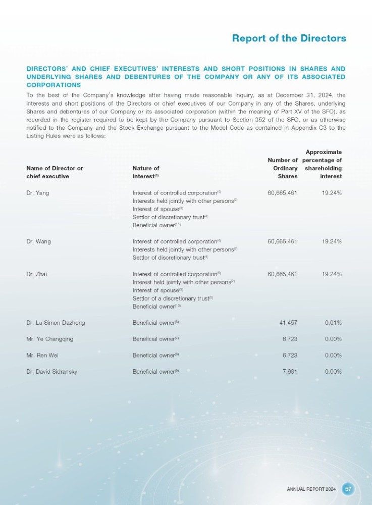 ANNUAL REPORT 2024 57 Report of the Directors DIRECTORS ’ AND CHIEF EXECUTIVES ’ INTERESTS AND SHORT POSITIONS IN SHARES AND UNDERLYING SHARES AND DEBENTURES OF THE COMPANY OR ANY OF ITS ASSOCIATED CORPORATIONS To the best of the Company ’ s knowledge after having made reasonable inquiry, as at December 31 , 2024 , the interests and short positions of the Directors or chief executives of our Company in any of the Shares, underlying Shares and debentures of our Company or its associated corporation (within the meaning of Part XV of the SFO), as recorded in the register required to be kept by the Company pursuant to Section 352 of the SFO, or as otherwise notified to the Company and the Stock Exchange pursuant to the Model Code as contained in Appendix C 3 to the Listing Rules were as follows : Approximate percentage of shareholding interest Number of Ordinary Shares Nature of Interest (1) Name of Director or chief executive 19.24% 60,665,461 Interest of controlled corporation (4) Dr. Yang Interests held jointly with other persons (2) Interest of spouse (3) Settlor of discretionary trust (4) Beneficial owner (11) 19.24% 60,665,461 Interest of controlled corporation (4) Dr. Wang Interests held jointly with other persons (2) Settlor of discretionary trust (4) 19.24% 60,665,461 Interest of controlled corporation (5) Dr. Zhai Interest held jointly with other persons (2) Interest of spouse (3) Settlor of a discretionary trust (5) Beneficial owner (10) 0.01% 41,457 Beneficial owner (6) Dr. Lu Simon Dazhong 0.00% 6,723 Beneficial owner (7) Mr. Ye Changqing 0.00% 6,723 Beneficial owner (8) Mr. Ren Wei 0.00% 7,981 Beneficial owner (9) Dr. David Sidransky
