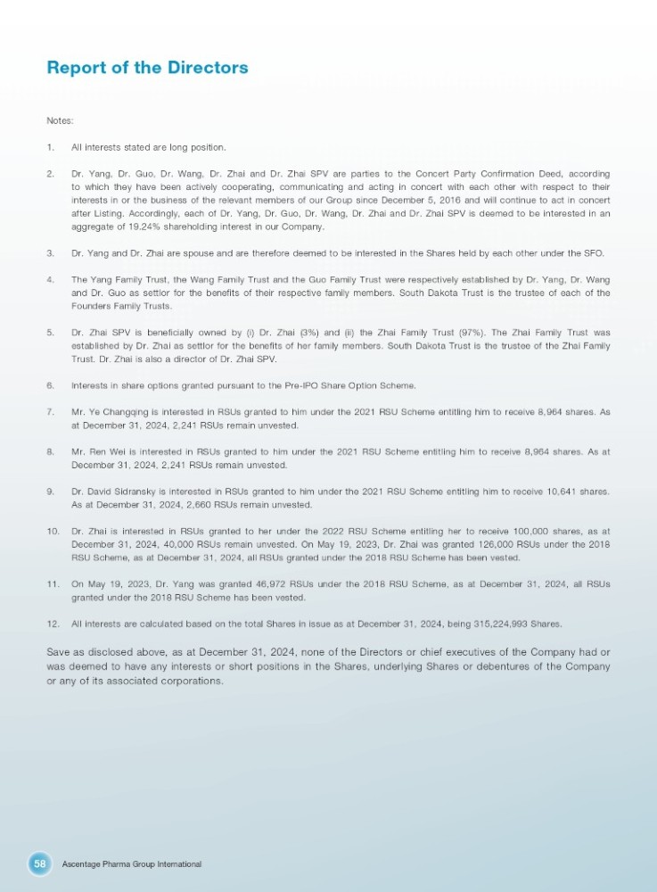 Ascentage Pharma Group International 58 Report of the Directors Notes: 1. All interests stated are long position. 2. Dr . Yang, Dr . Guo, Dr . Wang, Dr . Zhai and Dr . Zhai SPV are parties to the Concert Party Confirmation Deed, according to which they have been actively cooperating, communicating and acting in concert with each other with respect to their interests in or the business of the relevant members of our Group since December 5 , 2016 and will continue to act in concert after Listing . Accordingly, each of Dr . Yang, Dr . Guo, Dr . Wang, Dr . Zhai and Dr . Zhai SPV is deemed to be interested in an aggregate of 19 . 24 % shareholding interest in our Company . 3. Dr. Yang and Dr. Zhai are spouse and are therefore deemed to be interested in the Shares held by each other under the SFO. 4. The Yang Family Trust, the Wang Family Trust and the Guo Family Trust were respectively established by Dr . Yang, Dr . Wang and Dr . Guo as settlor for the benefits of their respective family members . South Dakota Trust is the trustee of each of the Founders Family Trusts . 5. Dr . Zhai SPV is beneficially owned by (i) Dr . Zhai ( 3 % ) and (ii) the Zhai Family Trust ( 97 % ) . The Zhai Family Trust was established by Dr . Zhai as settlor for the benefits of her family members . South Dakota Trust is the trustee of the Zhai Family Trust . Dr . Zhai is also a director of Dr . Zhai SPV . 6. Interests in share options granted pursuant to the Pre - IPO Share Option Scheme. 7. Mr . Ye Changqing is interested in RSUs granted to him under the 2021 RSU Scheme entitling him to receive 8 , 964 shares . As at December 31 , 2024 , 2 , 241 RSUs remain unvested . 8. Mr . Ren Wei is interested in RSUs granted to him under the 2021 RSU Scheme entitling him to receive 8 , 964 shares . As at December 31 , 2024 , 2 , 241 RSUs remain unvested . 9. Dr . David Sidransky is interested in RSUs granted to him under the 2021 RSU Scheme entitling him to receive 10 , 641 shares . As at December 31 , 2024 , 2 , 660 RSUs remain unvested . 10. Dr . Zhai is interested in RSUs granted to her under the 2022 RSU Scheme entitling her to receive 100 , 000 shares, as at December 31 , 2024 , 40 , 000 RSUs remain unvested . On May 19 , 2023 , Dr . Zhai was granted 126 , 000 RSUs under the 2018 RSU Scheme, as at December 31 , 2024 , all RSUs granted under the 2018 RSU Scheme has been vested . 11. On May 19 , 2023 , Dr . Yang was granted 46 , 972 RSUs under the 2018 RSU Scheme, as at December 31 , 2024 , all RSUs granted under the 2018 RSU Scheme has been vested . 12. All interests are calculated based on the total Shares in issue as at December 31, 2024, being 315,224,993 Shares. Save as disclosed above, as at December 31 , 2024 , none of the Directors or chief executives of the Company had or was deemed to have any interests or short positions in the Shares, underlying Shares or debentures of the Company or any of its associated corporations .