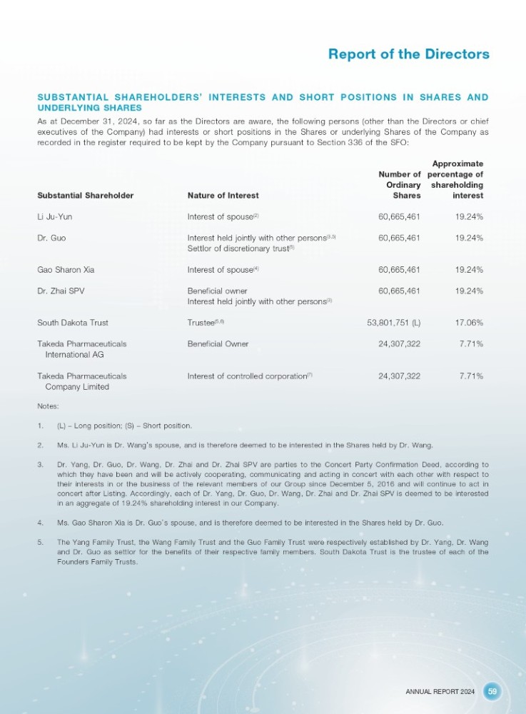 ANNUAL REPORT 2024 59 Report of the Directors SUBSTANTIAL SHAREHOLDERS ’ INTERESTS AND SHORT POSITIONS IN SHARES AND UNDERLYING SHARES As at December 31 , 2024 , so far as the Directors are aware, the following persons (other than the Directors or chief executives of the Company) had interests or short positions in the Shares or underlying Shares of the Company as recorded in the register required to be kept by the Company pursuant to Section 336 of the SFO : Substantial Shareholder Nature of Interest Number of Ordinary Shares Approximate percentage of shareholding interest Li Ju - Yun Interest of spouse (2) 60,665,461 19.24% Dr. Guo 60,665,461 19.24% Interest held jointly with other persons (3,5) Settlor of discretionary trust (5) Gao Sharon Xia Interest of spouse (4) 60,665,461 19.24% Dr. Zhai SPV 60,665,461 19.24% Beneficial owner Interest held jointly with other persons (3) South Dakota Trust Trustee (5,6) 53,801,751 (L) 17.06% Takeda Pharmaceuticals International AG Beneficial Owner 24,307,322 7.71% Takeda Pharmaceuticals Company Limited Interest of controlled corporation (7) 24,307,322 7.71% Notes: 1. (L) – Long position; (S) – Short position. 2. Ms. Li Ju - Yun is Dr. Wang ’ s spouse, and is therefore deemed to be interested in the Shares held by Dr. Wang. 3. Dr . Yang, Dr . Guo, Dr . Wang, Dr . Zhai and Dr . Zhai SPV are parties to the Concert Party Confirmation Deed, according to which they have been and will be actively cooperating, communicating and acting in concert with each other with respect to their interests in or the business of the relevant members of our Group since December 5 , 2016 and will continue to act in concert after Listing . Accordingly, each of Dr . Yang, Dr . Guo, Dr . Wang, Dr . Zhai and Dr . Zhai SPV is deemed to be interested in an aggregate of 19 . 24 % shareholding interest in our Company . 4. Ms. Gao Sharon Xia is Dr. Guo ’ s spouse, and is therefore deemed to be interested in the Shares held by Dr. Guo. 5. The Yang Family Trust, the Wang Family Trust and the Guo Family Trust were respectively established by Dr . Yang, Dr . Wang and Dr . Guo as settlor for the benefits of their respective family members . South Dakota Trust is the trustee of each of the Founders Family Trusts .