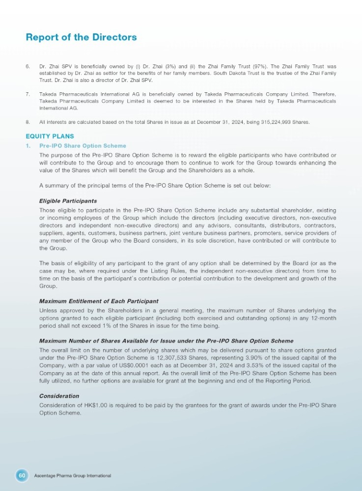 Ascentage Pharma Group International 60 Report of the Directors 6. Dr . Zhai SPV is beneficially owned by (i) Dr . Zhai ( 3 % ) and (ii) the Zhai Family Trust ( 97 % ) . The Zhai Family Trust was established by Dr . Zhai as settlor for the benefits of her family members . South Dakota Trust is the trustee of the Zhai Family Trust . Dr . Zhai is also a director of Dr . Zhai SPV . 7. Takeda Pharmaceuticals International AG is beneficially owned by Takeda Pharmaceuticals Company Limited . Therefore, Takeda Pharmaceuticals Company Limited is deemed to be interested in the Shares held by Takeda Pharmaceuticals International AG . 8. All interests are calculated based on the total Shares in issue as at December 31, 2024, being 315,224,993 Shares. EQUITY PLANS 1. Pre - IPO Share Option Scheme The purpose of the Pre - IPO Share Option Scheme is to reward the eligible participants who have contributed or will contribute to the Group and to encourage them to continue to work for the Group towards enhancing the value of the Shares which will benefit the Group and the Shareholders as a whole . A summary of the principal terms of the Pre - IPO Share Option Scheme is set out below : Eligible Participants Those eligible to participate in the Pre - IPO Share Option Scheme include any substantial shareholder, existing or incoming employees of the Group which include the directors (including executive directors, non - executive directors and independent non - executive directors) and any advisors, consultants, distributors, contractors, suppliers, agents, customers, business partners, joint venture business partners, promoters, service providers of any member of the Group who the Board considers, in its sole discretion, have contributed or will contribute to the Group . The basis of eligibility of any participant to the grant of any option shall be determined by the Board (or as the case may be, where required under the Listing Rules, the independent non - executive directors) from time to time on the basis of the participant ’ s contribution or potential contribution to the development and growth of the Group . Maximum Entitlement of Each Participant Unless approved by the Shareholders in a general meeting, the maximum number of Shares underlying the options granted to each eligible participant (including both exercised and outstanding options) in any 12 - month period shall not exceed 1 % of the Shares in issue for the time being . Maximum Number of Shares Available for Issue under the Pre - IPO Share Option Scheme The overall limit on the number of underlying shares which may be delivered pursuant to share options granted under the Pre - IPO Share Option Scheme is 12 , 307 , 533 Shares, representing 3 . 90 % of the issued capital of the Company, with a par value of US $ 0 . 0001 each as at December 31 , 2024 and 3 . 53 % of the issued capital of the Company as at the date of this annual report . As the overall limit of the Pre - IPO Share Option Scheme has been fully utilized, no further options are available for grant at the beginning and end of the Reporting Period . Consideration Consideration of HK $ 1 . 00 is required to be paid by the grantees for the grant of awards under the Pre - IPO Share Option Scheme .