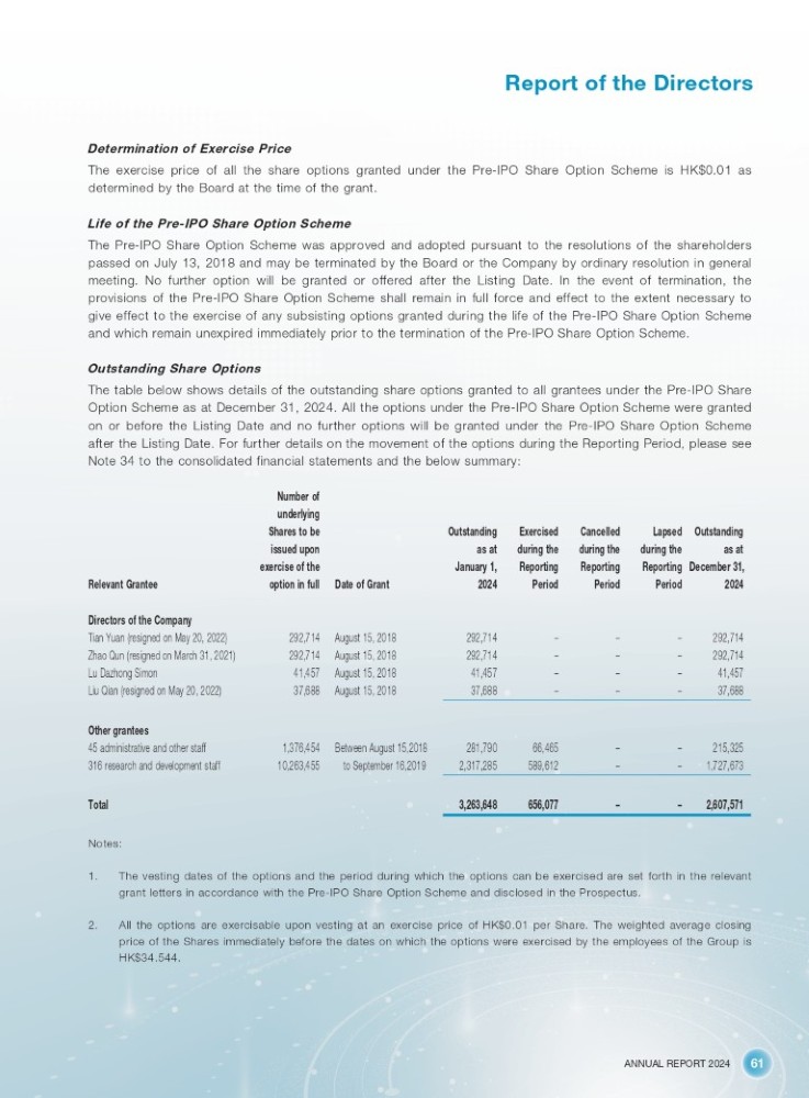 ANNUAL REPORT 2024 61 Report of the Directors Determination of Exercise Price The exercise price of all the share options granted under the Pre - IPO Share Option Scheme is HK $ 0 . 01 as determined by the Board at the time of the grant . Life of the Pre - IPO Share Option Scheme The Pre - IPO Share Option Scheme was approved and adopted pursuant to the resolutions of the shareholders passed on July 13 , 2018 and may be terminated by the Board or the Company by ordinary resolution in general meeting . No further option will be granted or offered after the Listing Date . In the event of termination, the provisions of the Pre - IPO Share Option Scheme shall remain in full force and effect to the extent necessary to give effect to the exercise of any subsisting options granted during the life of the Pre - IPO Share Option Scheme and which remain unexpired immediately prior to the termination of the Pre - IPO Share Option Scheme . Outstanding Share Options The table below shows details of the outstanding share options granted to all grantees under the Pre - IPO Share Option Scheme as at December 31 , 2024 . All the options under the Pre - IPO Share Option Scheme were granted on or before the Listing Date and no further options will be granted under the Pre - IPO Share Option Scheme after the Listing Date . For further details on the movement of the options during the Reporting Period, please see Note 34 to the consolidated financial statements and the below summary : Number of Outstanding Lapsed Cancelled Exercised Outstanding underlying Shares to be as at during the during the during the as at issued upon December 31, Reporting Reporting Reporting January 1, exercise of the 2024 Period Period Period 2024 Date of Grant option in full Relevant Grantee Directors of the Company 292,714 – – – 292,714 August 15, 2018 292,714 Tian Yuan (resigned on May 20, 2022) 292,714 – – – 292,714 August 15, 2018 292,714 Zhao Qun (resigned on March 31, 2021) 41,457 – – – 41,457 August 15, 2018 41,457 Lu Dazhong Simon 37,688 – – – 37,688 August 15, 2018 37,688 Liu Qian (resigned on May 20, 2022) Other grantees 215,325 – – 66,465 281,790 Between August 15,2018 1,376,454 45 administrative and other staff 1,727,673 – – 589,612 2,317,285 to September 16,2019 10,263,455 316 research and development staff 2,607,571 – – 656,077 3,263,648 Total Notes: 1. The vesting dates of the options and the period during which the options can be exercised are set forth in the relevant grant letters in accordance with the Pre - IPO Share Option Scheme and disclosed in the Prospectus . 2. All the options are exercisable upon vesting at an exercise price of HK $ 0 . 01 per Share . The weighted average closing price of the Shares immediately before the dates on which the options were exercised by the employees of the Group is HK $ 34 . 544 .