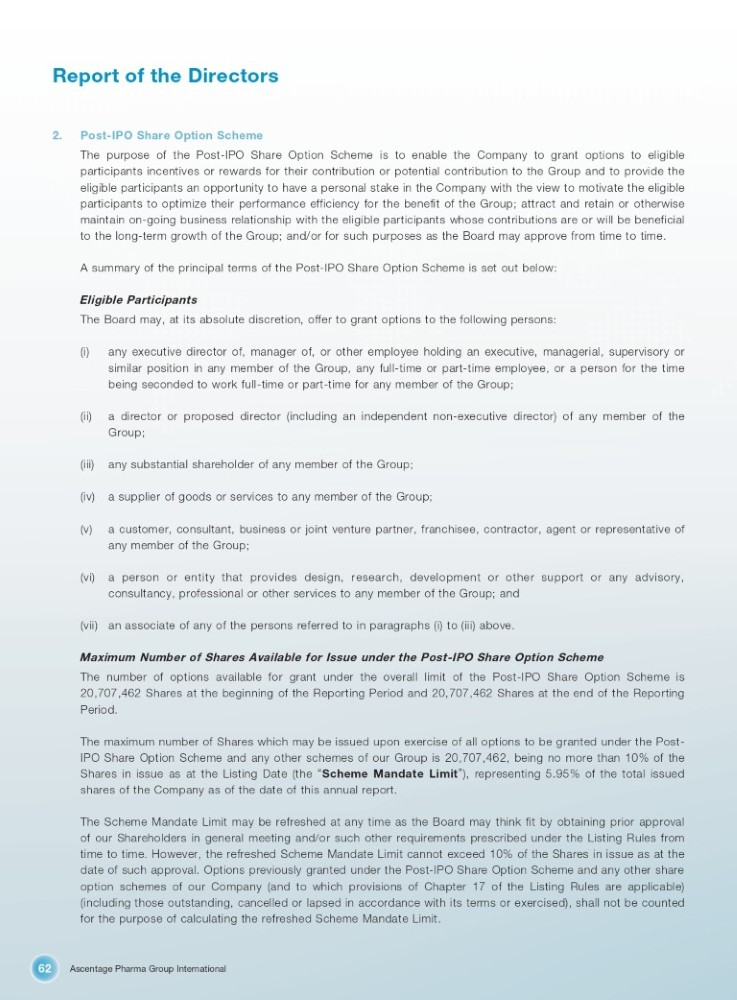 Ascentage Pharma Group International 62 Report of the Directors 2. Post - IPO Share Option Scheme The purpose of the Post - IPO Share Option Scheme is to enable the Company to grant options to eligible participants incentives or rewards for their contribution or potential contribution to the Group and to provide the eligible participants an opportunity to have a personal stake in the Company with the view to motivate the eligible participants to optimize their performance efficiency for the benefit of the Group ; attract and retain or otherwise maintain on - going business relationship with the eligible participants whose contributions are or will be beneficial to the long - term growth of the Group ; and/or for such purposes as the Board may approve from time to time . A summary of the principal terms of the Post - IPO Share Option Scheme is set out below : Eligible Participants The Board may, at its absolute discretion, offer to grant options to the following persons : (i) any executive director of, manager of, or other employee holding an executive, managerial, supervisory or similar position in any member of the Group, any full - time or part - time employee, or a person for the time being seconded to work full - time or part - time for any member of the Group ; (ii) a director or proposed director (including an independent non - executive director) of any member of the Group; (iii) any substantial shareholder of any member of the Group; (iv) a supplier of goods or services to any member of the Group; (v) a customer, consultant, business or joint venture partner, franchisee, contractor, agent or representative of any member of the Group; (vi) a person or entity that provides design, research, development or other support or any advisory, consultancy, professional or other services to any member of the Group; and (vii) an associate of any of the persons referred to in paragraphs (i) to (iii) above. Maximum Number of Shares Available for Issue under the Post - IPO Share Option Scheme The number of options available for grant under the overall limit of the Post - IPO Share Option Scheme is 20 , 707 , 462 Shares at the beginning of the Reporting Period and 20 , 707 , 462 Shares at the end of the Reporting Period . The maximum number of Shares which may be issued upon exercise of all options to be granted under the Post - IPO Share Option Scheme and any other schemes of our Group is 20 , 707 , 462 , being no more than 10 % of the Shares in issue as at the Listing Date (the “ Scheme Mandate Limit ” ), representing 5 . 95 % of the total issued shares of the Company as of the date of this annual report . The Scheme Mandate Limit may be refreshed at any time as the Board may think fit by obtaining prior approval of our Shareholders in general meeting and/or such other requirements prescribed under the Listing Rules from time to time . However, the refreshed Scheme Mandate Limit cannot exceed 10 % of the Shares in issue as at the date of such approval . Options previously granted under the Post - IPO Share Option Scheme and any other share option schemes of our Company (and to which provisions of Chapter 17 of the Listing Rules are applicable) (including those outstanding, cancelled or lapsed in accordance with its terms or exercised), shall not be counted for the purpose of calculating the refreshed Scheme Mandate Limit .