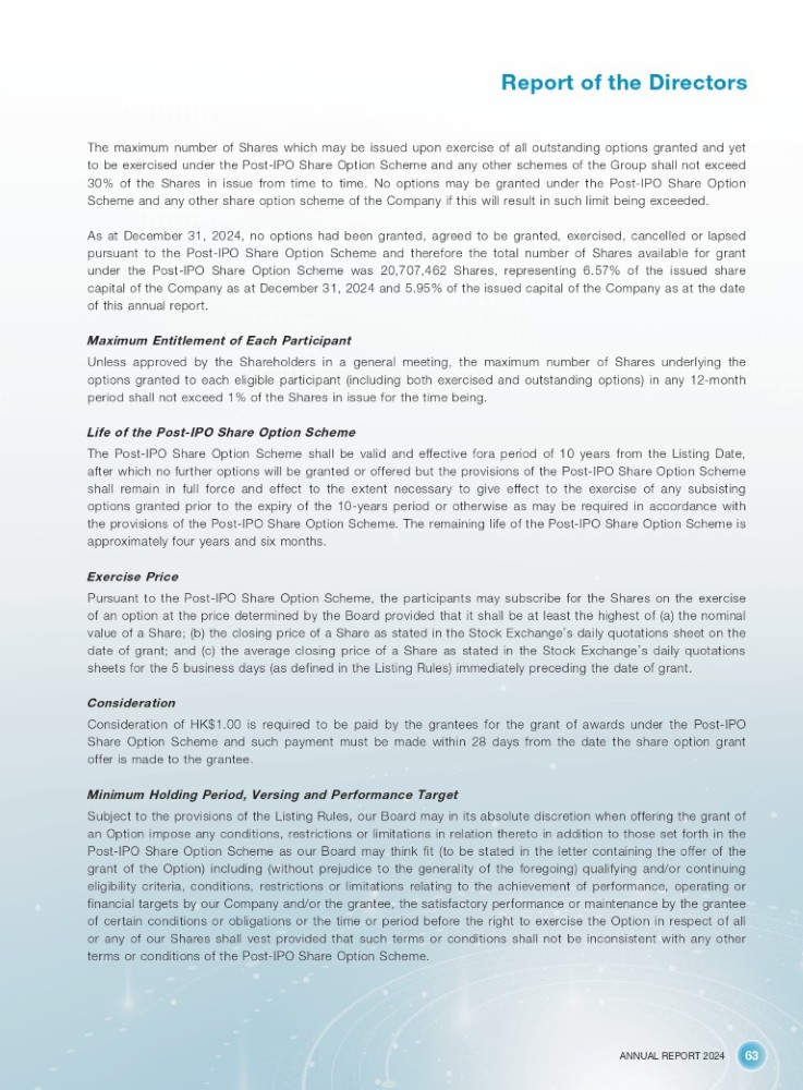 ANNUAL REPORT 2024 63 Report of the Directors The maximum number of Shares which may be issued upon exercise of all outstanding options granted and yet to be exercised under the Post - IPO Share Option Scheme and any other schemes of the Group shall not exceed 30 % of the Shares in issue from time to time . No options may be granted under the Post - IPO Share Option Scheme and any other share option scheme of the Company if this will result in such limit being exceeded . As at December 31 , 2024 , no options had been granted, agreed to be granted, exercised, cancelled or lapsed pursuant to the Post - IPO Share Option Scheme and therefore the total number of Shares available for grant under the Post - IPO Share Option Scheme was 20 , 707 , 462 Shares, representing 6 . 57 % of the issued share capital of the Company as at December 31 , 2024 and 5 . 95 % of the issued capital of the Company as at the date of this annual report . Maximum Entitlement of Each Participant Unless approved by the Shareholders in a general meeting, the maximum number of Shares underlying the options granted to each eligible participant (including both exercised and outstanding options) in any 12 - month period shall not exceed 1 % of the Shares in issue for the time being . Life of the Post - IPO Share Option Scheme The Post - IPO Share Option Scheme shall be valid and effective fora period of 10 years from the Listing Date, after which no further options will be granted or offered but the provisions of the Post - IPO Share Option Scheme shall remain in full force and effect to the extent necessary to give effect to the exercise of any subsisting options granted prior to the expiry of the 10 - years period or otherwise as may be required in accordance with the provisions of the Post - IPO Share Option Scheme . The remaining life of the Post - IPO Share Option Scheme is approximately four years and six months . Exercise Price Pursuant to the Post - IPO Share Option Scheme, the participants may subscribe for the Shares on the exercise of an option at the price determined by the Board provided that it shall be at least the highest of (a) the nominal value of a Share ; (b) the closing price of a Share as stated in the Stock Exchange ’ s daily quotations sheet on the date of grant ; and (c) the average closing price of a Share as stated in the Stock Exchange ’ s daily quotations sheets for the 5 business days (as defined in the Listing Rules) immediately preceding the date of grant . Consideration Consideration of HK $ 1 . 00 is required to be paid by the grantees for the grant of awards under the Post - IPO Share Option Scheme and such payment must be made within 28 days from the date the share option grant offer is made to the grantee . Minimum Holding Period, Versing and Performance Target Subject to the provisions of the Listing Rules, our Board may in its absolute discretion when offering the grant of an Option impose any conditions, restrictions or limitations in relation thereto in addition to those set forth in the Post - IPO Share Option Scheme as our Board may think fit (to be stated in the letter containing the offer of the grant of the Option) including (without prejudice to the generality of the foregoing) qualifying and/or continuing eligibility criteria, conditions, restrictions or limitations relating to the achievement of performance, operating or financial targets by our Company and/or the grantee, the satisfactory performance or maintenance by the grantee of certain conditions or obligations or the time or period before the right to exercise the Option in respect of all or any of our Shares shall vest provided that such terms or conditions shall not be inconsistent with any other terms or conditions of the Post - IPO Share Option Scheme .