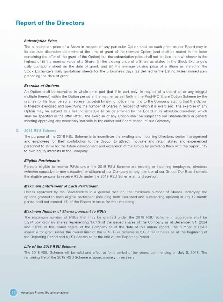 Ascentage Pharma Group International 64 Report of the Directors Subscription Price The subscription price of a Share in respect of any particular Option shall be such price as our Board may in its absolute discretion determine at the time of grant of the relevant Option (and shall be stated in the letter containing the offer of the grant of the Option) but the subscription price shall not be less than whichever is the highest of (i) the nominal value of a Share ; (ii) the closing price of a Share as stated in the Stock Exchange ’ s daily quotations sheet on the date of grant ; and (iii) the average closing price of a Share as stated in the Stock Exchange ’ s daily quotations sheets for the 5 business days (as defined in the Listing Rules) immediately preceding the date of grant . Exercise of Options An Option shall be exercised in whole or in part (but if in part only, in respect of a board lot or any integral multiple thereof) within the Option period in the manner as set forth in the Post - IPO Share Option Scheme by the grantee (or his legal personal representative(s)) by giving notice in writing to the Company stating that the Option is thereby exercised and specifying the number of Shares in respect of which it is exercised . The exercise of any Option may be subject to a vesting schedule to be determined by the Board in its absolute discretion, which shall be specified in the offer letter . The exercise of any Option shall be subject to our Shareholders in general meeting approving any necessary increase in the authorised Share capital of our Company . 3. 2018 RSU Scheme The purpose of the 2018 RSU Scheme is to incentivize the existing and incoming Directors, senior management and employees for their contribution to the Group, to attract, motivate and retain skilled and experienced personnel to strive for the future development and expansion of the Group by providing them with the opportunity to own equity interests in the Company . Eligible Participants Persons eligible to receive RSUs under the 2018 RSU Scheme are existing or incoming employees, directors (whether executive or non - executive) or officers of our Company or any member of our Group . Our Board selects the eligible persons to receive RSUs under the 2018 RSU Scheme at its discretion . Maximum Entitlement of Each Participant Unless approved by the Shareholders in a general meeting, the maximum number of Shares underlying the options granted to each eligible participant (including both exercised and outstanding options) in any 12 - month period shall not exceed 1 % of the Shares in issue for the time being . Maximum Number of Shares pursuant to RSUs The maximum number of RSUs that may be granted under the 2018 RSU Scheme in aggregate shall be 5 , 274 , 657 ordinary shares representing 1 . 67 % of the issued shares of the Company as at December 31 , 2024 and 1 . 51 % of the issued capital of the Company as at the date of this annual report . The number of RSUs available for grant under the overall limit of the 2018 RSU Scheme is 2 , 087 , 693 Shares as at the beginning of the Reporting Period and 6 , 294 Shares as at the end of the Reporting Period . Life of the 2018 RSU Scheme The 2018 RSU Scheme will be valid and effective for a period of ten years, commencing on July 6 , 2018 . The remaining life of the 2018 RSU Scheme is approximately three years .