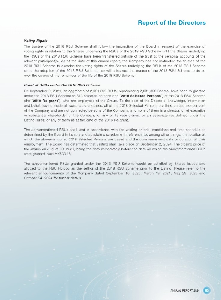 ANNUAL REPORT 2024 65 Report of the Directors Voting Rights The trustee of the 2018 RSU Scheme shall follow the instruction of the Board in respect of the exercise of voting rights in relation to the Shares underlying the RSUs of the 2018 RSU Scheme until the Shares underlying the RSUs of the 2018 RSU Scheme have been transferred outside of the trust to the personal accounts of the relevant participant(s) . As at the date of this annual report, the Company has not instructed the trustee of the 2018 RSU Scheme to exercise the voting rights of the Shares underlying the RSUs of the 2018 RSU Scheme since the adoption of the 2018 RSU Scheme, nor will it instruct the trustee of the 2018 RSU Scheme to do so over the course of the remainder of the life of the 2018 RSU Scheme . Grant of RSUs under the 2018 RSU Scheme On September 2 , 2024 , an aggregate of 2 , 081 , 399 RSUs, representing 2 , 081 , 399 Shares, have been re - granted under the 2018 RSU Scheme to 513 selected persons (the “ 2018 Selected Persons ” ) of the 2018 RSU Scheme (the “ 2018 Re - grant ” ), who are employees of the Group . To the best of the Directors ’ knowledge, information and belief, having made all reasonable enquiries, all of the 2018 Selected Persons are third parties independent of the Company and are not connected persons of the Company, and none of them is a director, chief executive or substantial shareholder of the Company or any of its subsidiaries, or an associate (as defined under the Listing Rules) of any of them as at the date of the 2018 Re - grant . The abovementioned RSUs shall vest in accordance with the vesting criteria, conditions and time schedule as determined by the Board in its sole and absolute discretion with reference to, among other things, the location at which the abovementioned 2018 Selected Persons are based and the commencement date or duration of their employment . The Board has determined that vesting shall take place on September 2 , 2024 . The closing price of the shares on August 30 , 2024 , being the date immediately before the date on which the abovementioned RSUs were granted, was HK $ 33 . 15 . The abovementioned RSUs granted under the 2018 RSU Scheme would be satisfied by Shares issued and allotted to the RSU Holdco as the settlor of the 2018 RSU Scheme prior to the Listing . Please refer to the relevant announcements of the Company dated September 16 , 2020 , March 19 , 2021 , May 29 , 2023 and October 24 , 2024 for further details .
