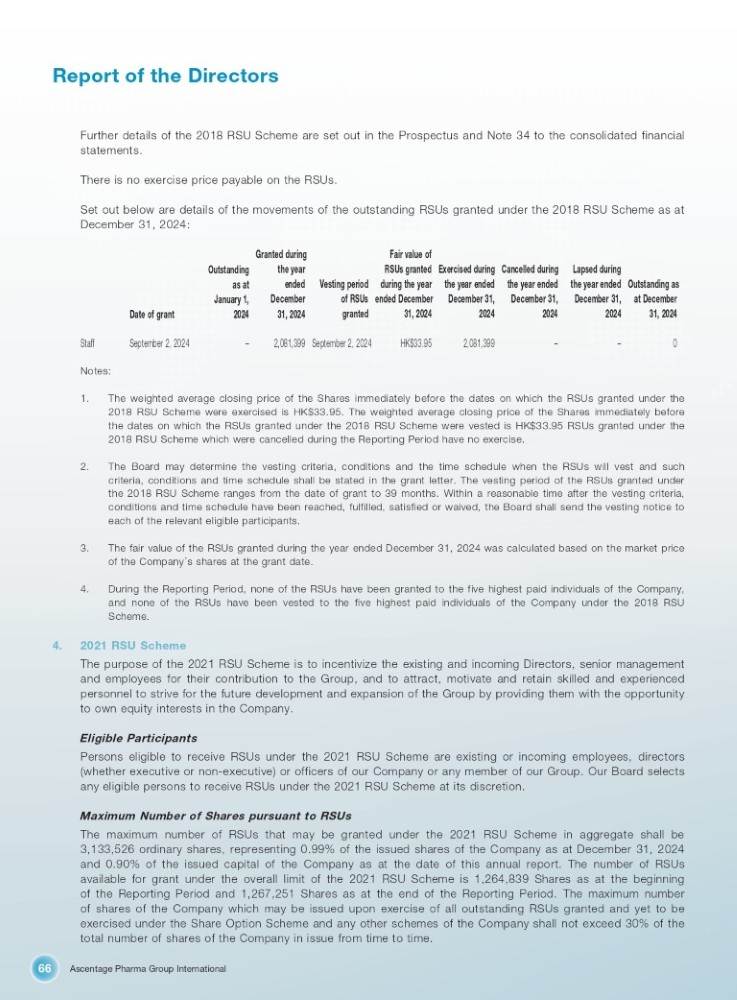 Ascentage Pharma Group International 66 Report of the Directors Further details of the 2018 RSU Scheme are set out in the Prospectus and Note 34 to the consolidated financial statements. There is no exercise price payable on the RSUs. Set out below are details of the movements of the outstanding RSUs granted under the 2018 RSU Scheme as at December 31, 2024: Outstanding as at December Lapsed during the year ended December 31 , Cancelled during the year ended December 31 , Exercised during the year ended December 31 , Fair value of RSUs granted during the year ended December Vesting period of RSUs Granted during the year ended December Outstanding as at January 1, 31, 2024 2024 2024 2024 31, 2024 granted 31, 2024 2024 Date of grant 0 – – 2,081,399 HK$33.95 September 2, 2024 2,081,399 – September 2, 2024 Staff Notes: 1. The weighted average closing price of the Shares immediately before the dates on which the RSUs granted under the 2018 RSU Scheme were exercised is HK $ 33 . 95 . The weighted average closing price of the Shares immediately before the dates on which the RSUs granted under the 2018 RSU Scheme were vested is HK $ 33 . 95 RSUs granted under the 2018 RSU Scheme which were cancelled during the Reporting Period have no exercise . 2. The Board may determine the vesting criteria, conditions and the time schedule when the RSUs will vest and such criteria, conditions and time schedule shall be stated in the grant letter . The vesting period of the RSUs granted under the 2018 RSU Scheme ranges from the date of grant to 39 months . Within a reasonable time after the vesting criteria, conditions and time schedule have been reached, fulfilled, satisfied or waived, the Board shall send the vesting notice to each of the relevant eligible participants . 3. The fair value of the RSUs granted during the year ended December 31 , 2024 was calculated based on the market price of the Company ’ s shares at the grant date . 4. During the Reporting Period, none of the RSUs have been granted to the five highest paid individuals of the Company, and none of the RSUs have been vested to the five highest paid individuals of the Company under the 2018 RSU Scheme . 4. 2021 RSU Scheme The purpose of the 2021 RSU Scheme is to incentivize the existing and incoming Directors, senior management and employees for their contribution to the Group, and to attract, motivate and retain skilled and experienced personnel to strive for the future development and expansion of the Group by providing them with the opportunity to own equity interests in the Company . Eligible Participants Persons eligible to receive RSUs under the 2021 RSU Scheme are existing or incoming employees, directors (whether executive or non - executive) or officers of our Company or any member of our Group . Our Board selects any eligible persons to receive RSUs under the 2021 RSU Scheme at its discretion . Maximum Number of Shares pursuant to RSUs The maximum number of RSUs that may be granted under the 2021 RSU Scheme in aggregate shall be 3 , 133 , 526 ordinary shares, representing 0 . 99 % of the issued shares of the Company as at December 31 , 2024 and 0 . 90 % of the issued capital of the Company as at the date of this annual report . The number of RSUs available for grant under the overall limit of the 2021 RSU Scheme is 1 , 264 , 839 Shares as at the beginning of the Reporting Period and 1 , 267 , 251 Shares as at the end of the Reporting Period . The maximum number of shares of the Company which may be issued upon exercise of all outstanding RSUs granted and yet to be exercised under the Share Option Scheme and any other schemes of the Company shall not exceed 30 % of the total number of shares of the Company in issue from time to time .