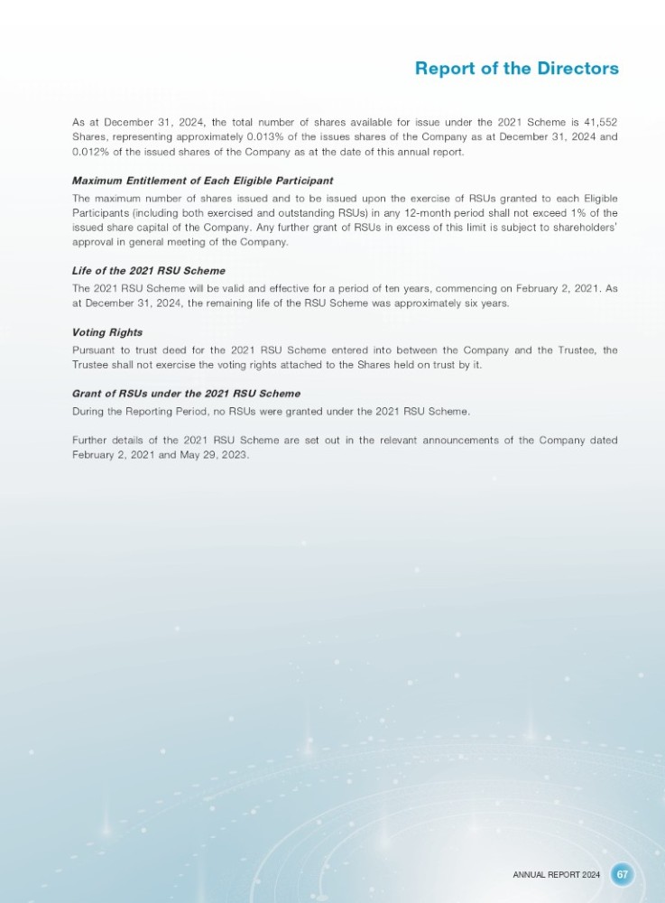 ANNUAL REPORT 2024 67 Report of the Directors As at December 31 , 2024 , the total number of shares available for issue under the 2021 Scheme is 41 , 552 Shares, representing approximately 0 . 013 % of the issues shares of the Company as at December 31 , 2024 and 0 . 012 % of the issued shares of the Company as at the date of this annual report . Maximum Entitlement of Each Eligible Participant The maximum number of shares issued and to be issued upon the exercise of RSUs granted to each Eligible Participants (including both exercised and outstanding RSUs) in any 12 - month period shall not exceed 1 % of the issued share capital of the Company . Any further grant of RSUs in excess of this limit is subject to shareholders ’ approval in general meeting of the Company . Life of the 2021 RSU Scheme The 2021 RSU Scheme will be valid and effective for a period of ten years, commencing on February 2 , 2021 . As at December 31 , 2024 , the remaining life of the RSU Scheme was approximately six years . Voting Rights Pursuant to trust deed for the 2021 RSU Scheme entered into between the Company and the Trustee, the Trustee shall not exercise the voting rights attached to the Shares held on trust by it . Grant of RSUs under the 2021 RSU Scheme During the Reporting Period, no RSUs were granted under the 2021 RSU Scheme . Further details of the 2021 RSU Scheme are set out in the relevant announcements of the Company dated February 2 , 2021 and May 29 , 2023 .