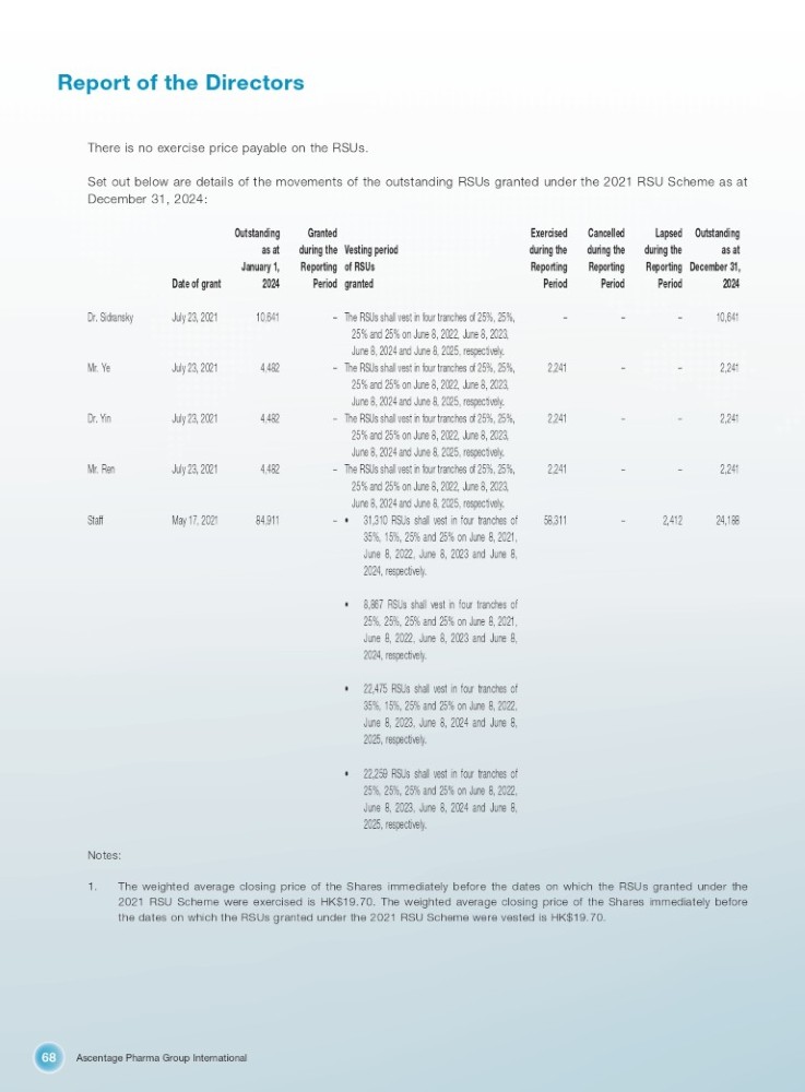 Ascentage Pharma Group International 68 Report of the Directors There is no exercise price payable on the RSUs. Set out below are details of the movements of the outstanding RSUs granted under the 2021 RSU Scheme as at December 31, 2024: Date of grant Outstanding as at January 1, 2024 Granted during the Vesting period Reporting of RSUs Period granted Exercised during the Reporting Period Cancelled during the Reporting Period Dr. Sidransky July 23, 2021 10,641 – The RSUs shall vest in four tranches of 25%, 25%, – – Lapsed Outstanding during the as at Reporting December 31 , Period 2024 – 10,641 – 4,482 July 23, 2021 Mr. Ye – 4,482 July 23, 2021 Dr. Yin – 4,482 July 23, 2021 Mr. Ren 2,241 – – 2,241 2,241 – – 2,241 2,241 – – 2,241 25% and 25% on June 8, 2022, June 8, 2023, June 8, 2024 and June 8, 2025, respectively. The RSUs shall vest in four tranches of 25%, 25%, 25% and 25% on June 8, 2022, June 8, 2023, June 8, 2024 and June 8, 2025, respectively. The RSUs shall vest in four tranches of 25%, 25%, 25% and 25% on June 8, 2022, June 8, 2023, June 8, 2024 and June 8, 2025, respectively. The RSUs shall vest in four tranches of 25%, 25%, 25% and 25% on June 8, 2022, June 8, 2023, June 8, 2024 and June 8, 2025, respectively. 24,188 2,412 – 58,311 – • 31,310 RSUs shall vest in four tranches of 35%, 15%, 25% and 25% on June 8, 2021, June 8, 2022, June 8, 2023 and June 8, 2024, respectively. 84,911 May 17, 2021 Staff • 8,867 RSUs shall vest in four tranches of 25%, 25%, 25% and 25% on June 8, 2021, June 8, 2022, June 8, 2023 and June 8, 2024, respectively. • 22,475 RSUs shall vest in four tranches of 35%, 15%, 25% and 25% on June 8, 2022, June 8, 2023, June 8, 2024 and June 8, 2025, respectively. • 22,259 RSUs shall vest in four tranches of 25%, 25%, 25% and 25% on June 8, 2022, June 8, 2023, June 8, 2024 and June 8, 2025, respectively. Notes: 1 . The weighted average closing price of the Shares immediately before the dates on which the RSUs granted under the 2021 RSU Scheme were exercised is HK $ 19 . 70 . The weighted average closing price of the Shares immediately before the dates on which the RSUs granted under the 2021 RSU Scheme were vested is HK $ 19 . 70 .