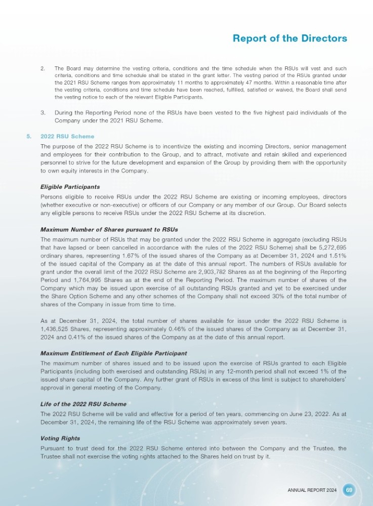 ANNUAL REPORT 2024 69 Report of the Directors 2. The Board may determine the vesting criteria, conditions and the time schedule when the RSUs will vest and such criteria, conditions and time schedule shall be stated in the grant letter . The vesting period of the RSUs granted under the 2021 RSU Scheme ranges from approximately 11 months to approximately 47 months . Within a reasonable time after the vesting criteria, conditions and time schedule have been reached, fulfilled, satisfied or waived, the Board shall send the vesting notice to each of the relevant Eligible Participants . 3. During the Reporting Period none of the RSUs have been vested to the five highest paid individuals of the Company under the 2021 RSU Scheme . 5. 2022 RSU Scheme The purpose of the 2022 RSU Scheme is to incentivize the existing and incoming Directors, senior management and employees for their contribution to the Group, and to attract, motivate and retain skilled and experienced personnel to strive for the future development and expansion of the Group by providing them with the opportunity to own equity interests in the Company . Eligible Participants Persons eligible to receive RSUs under the 2022 RSU Scheme are existing or incoming employees, directors (whether executive or non - executive) or officers of our Company or any member of our Group . Our Board selects any eligible persons to receive RSUs under the 2022 RSU Scheme at its discretion . Maximum Number of Shares pursuant to RSUs The maximum number of RSUs that may be granted under the 2022 RSU Scheme in aggregate (excluding RSUs that have lapsed or been cancelled in accordance with the rules of the 2022 RSU Scheme) shall be 5 , 272 , 695 ordinary shares, representing 1 . 67 % of the issued shares of the Company as at December 31 , 2024 and 1 . 51 % of the issued capital of the Company as at the date of this annual report . The numbers of RSUs available for grant under the overall limit of the 2022 RSU Scheme are 2 , 903 , 782 Shares as at the beginning of the Reporting Period and 1 , 764 , 995 Shares as at the end of the Reporting Period . The maximum number of shares of the Company which may be issued upon exercise of all outstanding RSUs granted and yet to be exercised under the Share Option Scheme and any other schemes of the Company shall not exceed 30 % of the total number of shares of the Company in issue from time to time . As at December 31 , 2024 , the total number of shares available for issue under the 2022 RSU Scheme is 1 , 436 , 525 Shares, representing approximately 0 . 46 % of the issued shares of the Company as at December 31 , 2024 and 0 . 41 % of the issued shares of the Company as at the date of this annual report . Maximum Entitlement of Each Eligible Participant The maximum number of shares issued and to be issued upon the exercise of RSUs granted to each Eligible Participants (including both exercised and outstanding RSUs) in any 12 - month period shall not exceed 1 % of the issued share capital of the Company . Any further grant of RSUs in excess of this limit is subject to shareholders ’ approval in general meeting of the Company . Life of the 2022 RSU Scheme The 2022 RSU Scheme will be valid and effective for a period of ten years, commencing on June 23 , 2022 . As at December 31 , 2024 , the remaining life of the RSU Scheme was approximately seven years . Voting Rights Pursuant to trust deed for the 2022 RSU Scheme entered into between the Company and the Trustee, the Trustee shall not exercise the voting rights attached to the Shares held on trust by it .