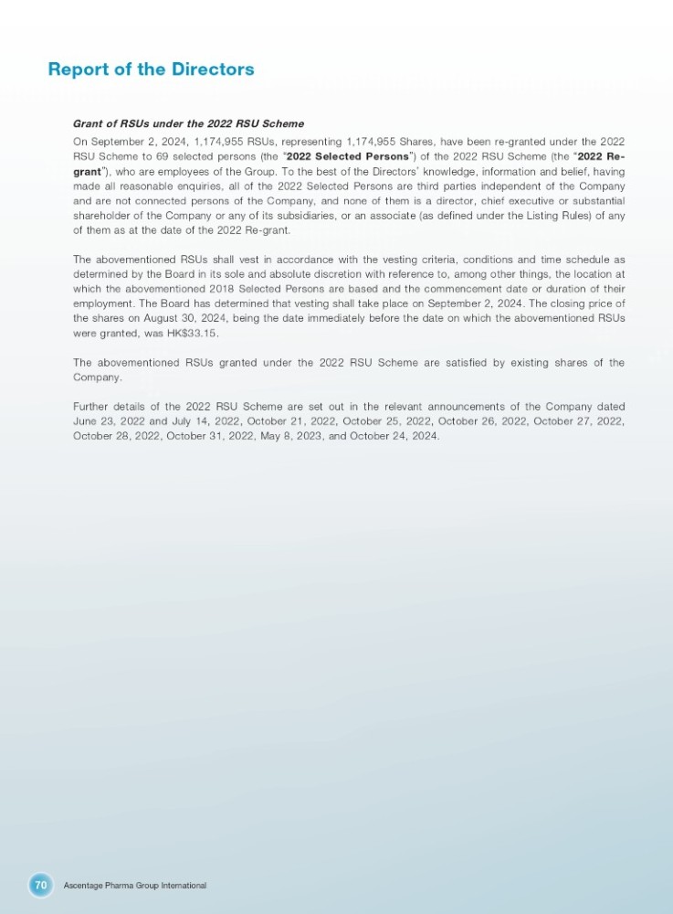 Ascentage Pharma Group International 70 Report of the Directors Grant of RSUs under the 2022 RSU Scheme On September 2 , 2024 , 1 , 174 , 955 RSUs, representing 1 , 174 , 955 Shares, have been re - granted under the 2022 RSU Scheme to 69 selected persons (the “ 2022 Selected Persons ” ) of the 2022 RSU Scheme (the “ 2022 Re - grant ” ), who are employees of the Group . To the best of the Directors ’ knowledge, information and belief, having made all reasonable enquiries, all of the 2022 Selected Persons are third parties independent of the Company and are not connected persons of the Company, and none of them is a director, chief executive or substantial shareholder of the Company or any of its subsidiaries, or an associate (as defined under the Listing Rules) of any of them as at the date of the 2022 Re - grant . The abovementioned RSUs shall vest in accordance with the vesting criteria, conditions and time schedule as determined by the Board in its sole and absolute discretion with reference to, among other things, the location at which the abovementioned 2018 Selected Persons are based and the commencement date or duration of their employment . The Board has determined that vesting shall take place on September 2 , 2024 . The closing price of the shares on August 30 , 2024 , being the date immediately before the date on which the abovementioned RSUs were granted, was HK $ 33 . 15 . The abovementioned RSUs granted under the 2022 RSU Scheme are satisfied by existing shares of the Company . Further details of the 2022 RSU Scheme are set out in the relevant announcements of the Company dated June 23 , 2022 and July 14 , 2022 , October 21 , 2022 , October 25 , 2022 , October 26 , 2022 , October 27 , 2022 , October 28 , 2022 , October 31 , 2022 , May 8 , 2023 , and October 24 , 2024 .