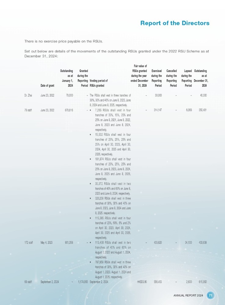 ANNUAL REPORT 2024 71 Report of the Directors There is no exercise price payable on the RSUs. Set out below are details of the movements of the outstanding RSUs granted under the 2022 RSU Scheme as at December 31, 2024: Date of grant Outstanding as at January 1, 2024 Granted during the Reporting Vesting period of Period RSUs granted Fair value of RSUs granted during the year ended December 31 , 2024 Exercised during the Reporting Period Cancelled during the Reporting Period Lapsed Outstanding during the as at Reporting December 31 , Period 2024 40,000 – – 30,000 – The RSUs shall vest in three tranches of – 70,000 June 23, 2022 Dr. Zhai 30%, 30% and 40% on June 8, 2023, June 8, 2024 and June 8, 2025, respectively. 350,401 6,068 – 314,147 – • 7,265 RSUs shall vest in four – 670,616 June 23, 2022 79 staff tranches of 35%, 15%, 25% and 25% on June 8, 2021, June 8, 2022, June 8, 2023 and June 8, 2024, respectively. • 15,532 RSUs shall vest in four tranches of 25%, 25%, 25% and 25% on April 30, 2023, April 30, 2024, April 30, 2025 and April 30, 2026, respectively. • 181,874 RSUs shall vest in four tranches of 25%, 25%, 25% and 25% on June 8, 2023, June 8, 2024, June 8, 2025 and June 8, 2026, respectively. • 30,372 RSUs shall vest in two tranches of 40% and 60% on June 8, 2023 and June 8, 2024, respectively. • 320,208 RSUs shall vest in three tranches of 30%, 30% and 40% on June 8, 2023, June 8, 2024 and June 8, 2025, respectively. • 115,365 RSUs shall vest in four tranches of 23%, 69%, 6% and 2% on April 30, 2023, April 30, 2024, April 30, 2025 and April 30, 2026, respectively. 433,638 34,100 – 433,620 – • 113,400 RSUs shall vest in two – 901,358 May 4, 2023 172 staff tranches of 40% and 60% on August 1, 2023 and August 1, 2024, respectively. • 787,958 RSUs shall vest in three tranches of 30%, 30% and 40% on August 1, 2023, August 1, 2024 and August 1, 2025, respectively. 615,902 2,600 – 556,453 HK$33.95 September 2, 2024 1,174,955 – September 2, 2024 69 staff
